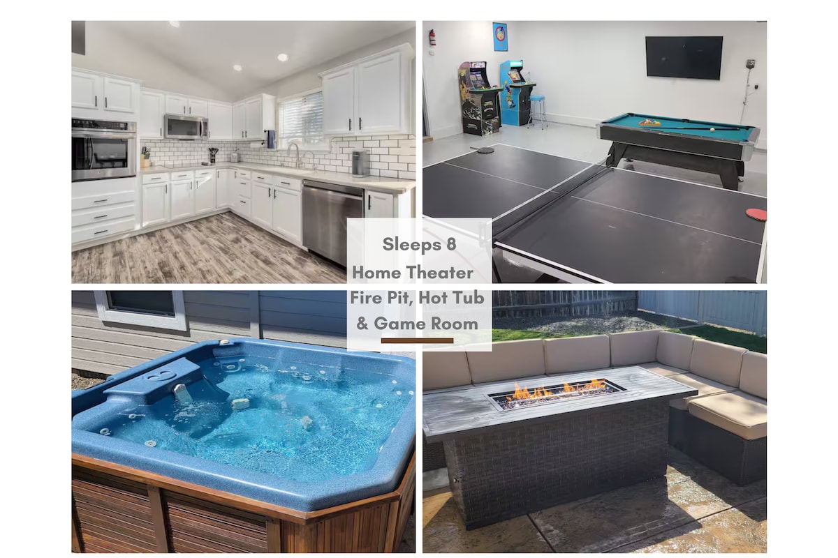 The Modern Farmhouse was recently remodeled with upscale amenities and everything you need for a comfortable stay! Enjoy your own delicious home cooked meals in the beautiful kitchen, gather in the dining room with seating for 8, enjoy a movie on Netflix or Disney+ on a huge 65" OLED 4K TV and 7.2 Klipsch Surround Sound with a large sectional providing seating for the whole family. Outside on the back patio you will find outdoor seating with a fire pit, a hot tub for 5, and a 6 burner BBQ.