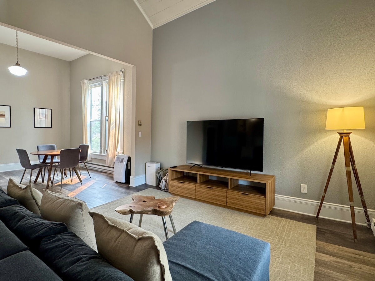 Nestled on historic First Street, this updated 1885 high-ceiling loft blends timeless charm with modern comfort + free parking. Inside, warm wood tones set the scene -- cook in the full kitchen, unwind in the living room with a 60" LED TV + wifi, or retreat upstairs to the loft’s inviting king bed. Step outside to antique shops, cafés, breweries, and riverfront strolls— all just steps away. Whether for a weekend escape or peaceful getaway, this retreat is your perfect Snohomish home base.