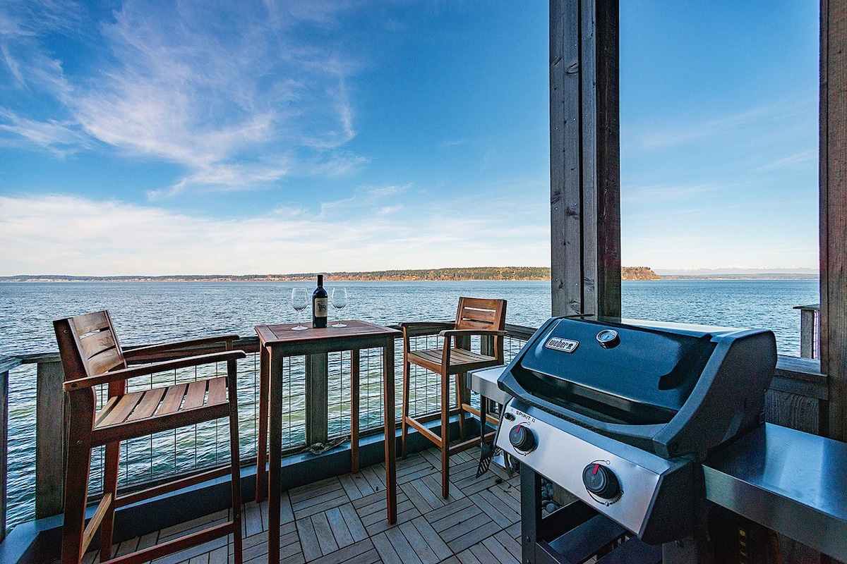 Enjoy breathtaking views of the Sound and Olympic Mountains while relaxing on one of the three decks of our newly remodeled waterfront home. Our modern beach house features three spacious upstairs bedrooms around a separate sitting area, a large living and dining space downstairs, and bathrooms on both levels. You can spot seals, bald eagles, and whales while walking along the no bank beach steps from our front door. Sip wine around the propane fire pit while enjoying the magnificent sunset.