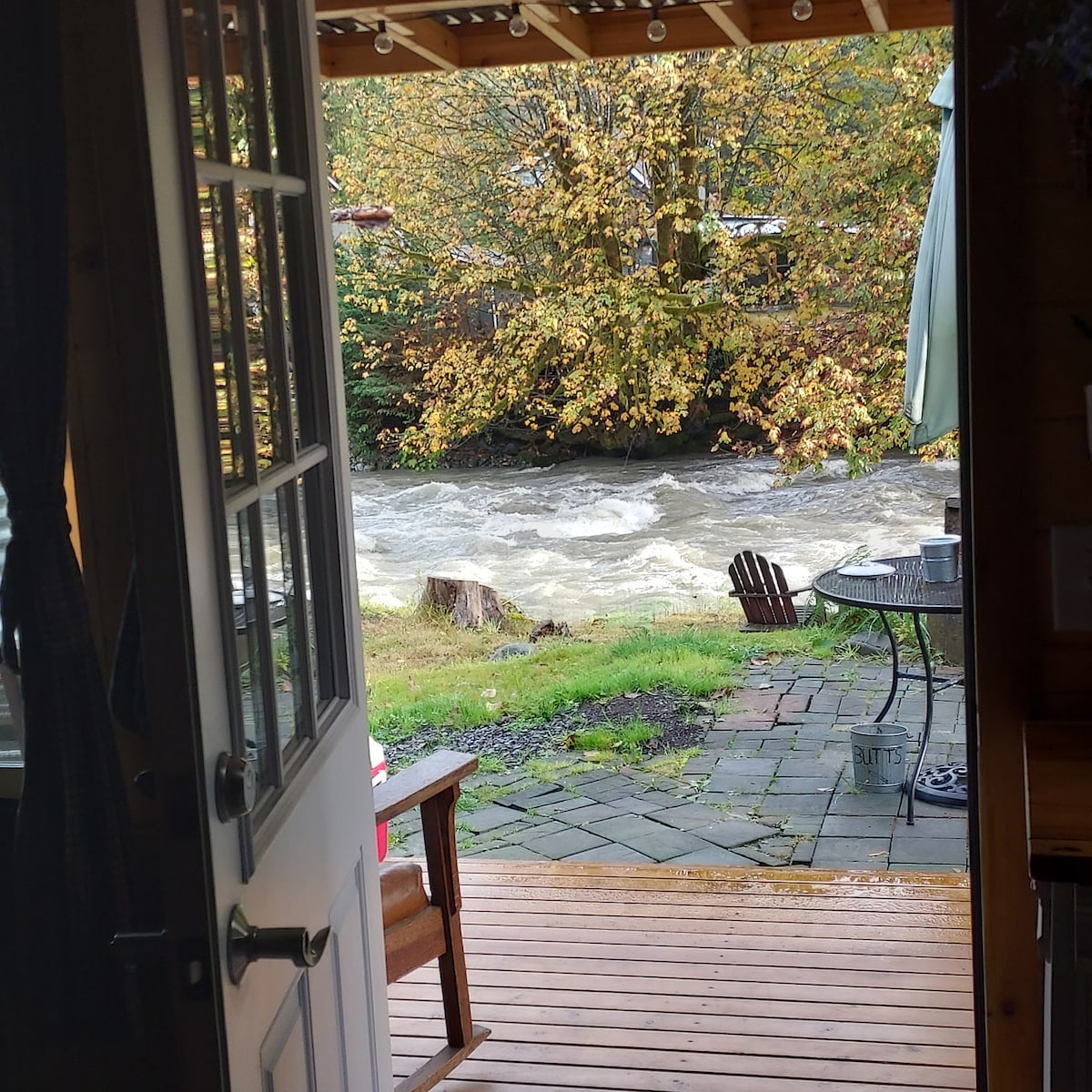 Romantic nature getaway, direct Waterfront access, less than hour from Seattle. Unique cozy Warm, studio Knotty Pine Glamping Cabin with Creekview & tranquil sounds. Private Hot Tub "Seasonal" Outdoor rinse Shower Avbl. Apr-Nov Bathroom is a private clean porta potty 5 steps from the door, string lighting outside & h/c water sink inside the cabin. Take in nature from the comfort cleanliness & safety of this small guest cabin. Bedroom is in the living room. Hostess lives on site in Aframe cabin.