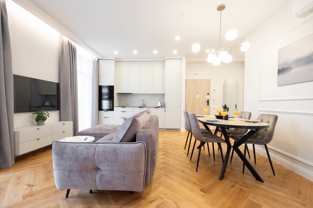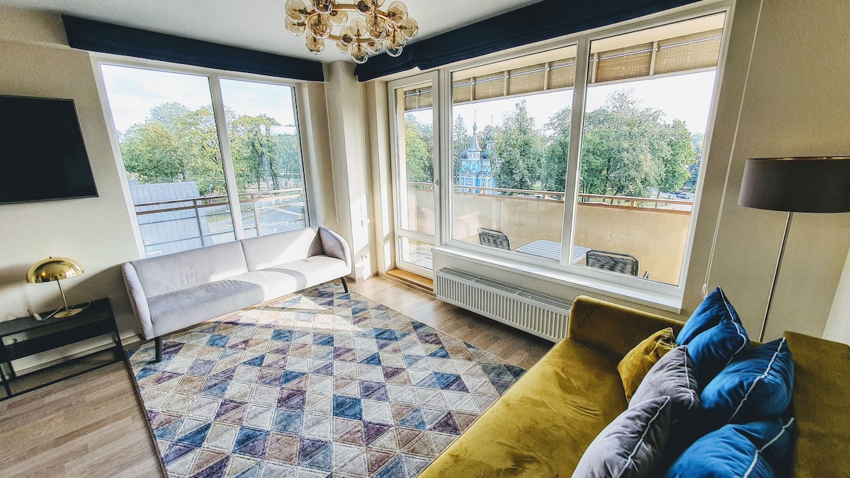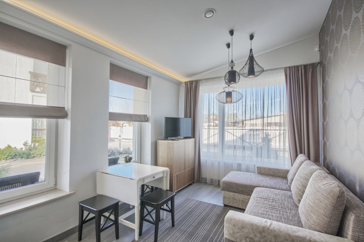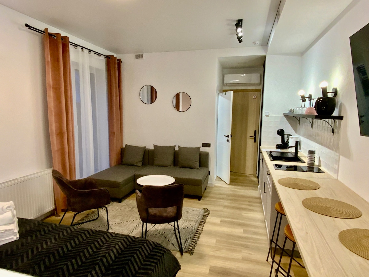 Freshly furnished studio in central Druskininkai – ideal for workations, couples, or small families. The bright living room transforms into a cozy sleeping space with a dedicated workspace. Enjoy two furnished balconies, A/C, fast Wi-Fi, and a fully equipped kitchen with dishwasher. Walk to AQUA Park (900 m), Vijūnėlės Pond (800 m), Druskonis Pond (600 m), and the Health Resort (650 m). Calm, stylish, and perfectly located for both rest and inspiration.