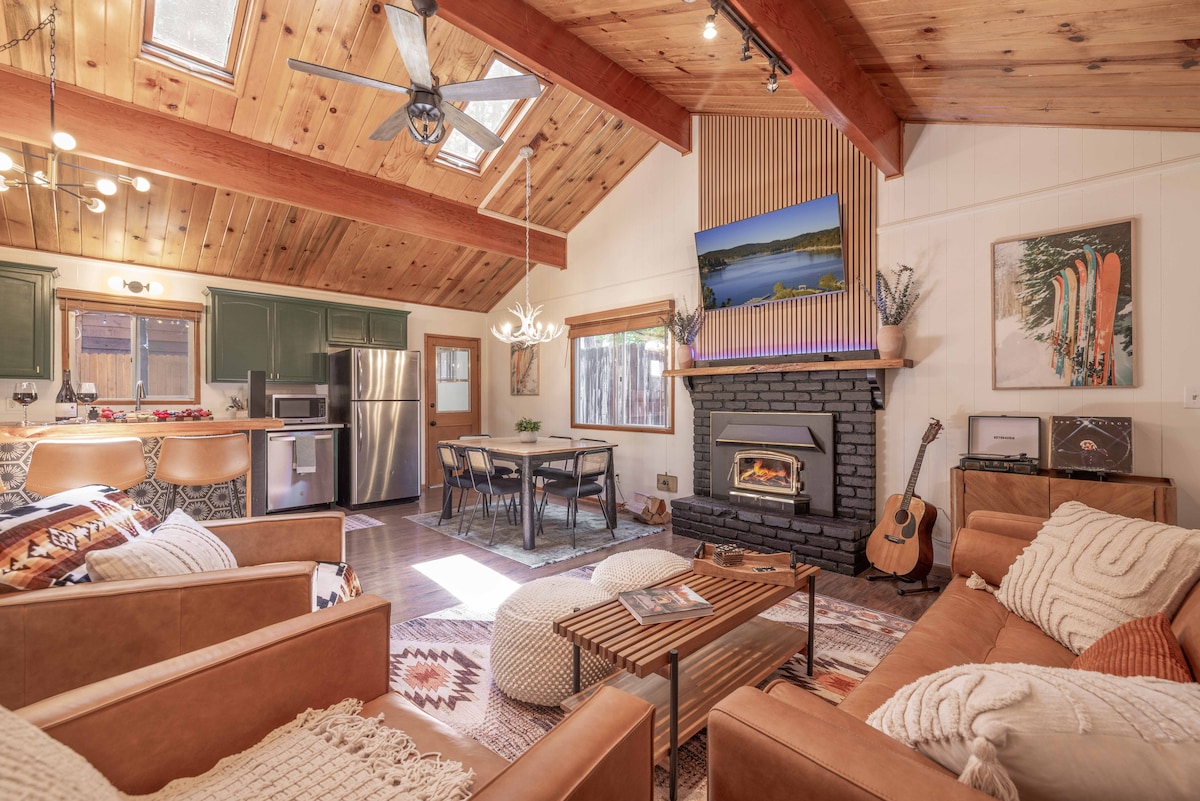 Steps to Snow Summit! Stylish smart-home cabin with private hot tub, BBQ, massage chair, and fireplace. 2BR/2BA sleeps 7. Full kitchen with dishwasher, Keurig + grinder. Fast Wi-Fi for streaming/work, EV charging (bring your cord), and easy keyless self check-in. Walk to lifts, bike park, cafés; minutes to The Village, trails, and the lake. Quiet street, dedicated parking. Perfect for families, couples, and friends seeking a central Big Bear Lake base. Book first tracks and hot-tub nights! Enjoy