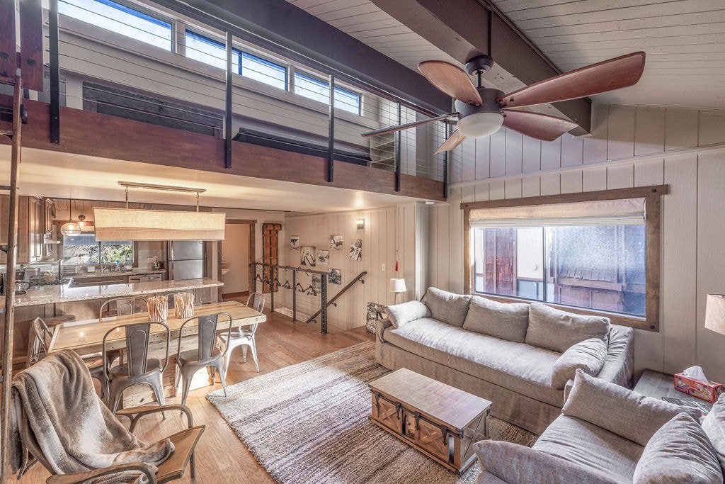 Sunlight fills this lovely second floor cabin unit, setting the mood for a day in the mountains. With high vaulted ceilings it feels open while still feeling cozy. Best of all, just a few minutes walk to the chairlift at snow summit. Fire up the BBQ and relax with friends and family after a day on the slopes or exploring the Village. A full kitchen for all your cooking needs and a smart TV for movie night. Settle in amongst the comfy decor, you're at the cabin now.