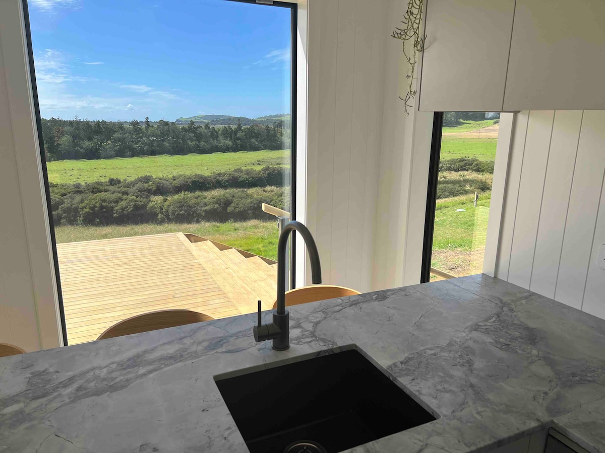 Feel your worries slip away as you journey through rolling green pastures to Coastal Acres Escape. Just 1.5 hours from the CBD and you’ve arrived. Pause for a moment. Take in a deep breath of sea air. You are standing on the deck. The Tasman sea stretches out below you between towering dune cliffs. The sun is getting low, casting a warm glow over the surrounding pastures. There is no one around. Just you and the horizon. Take a sip. Fire up the bbq. Enjoy dinner with the best view in the world.