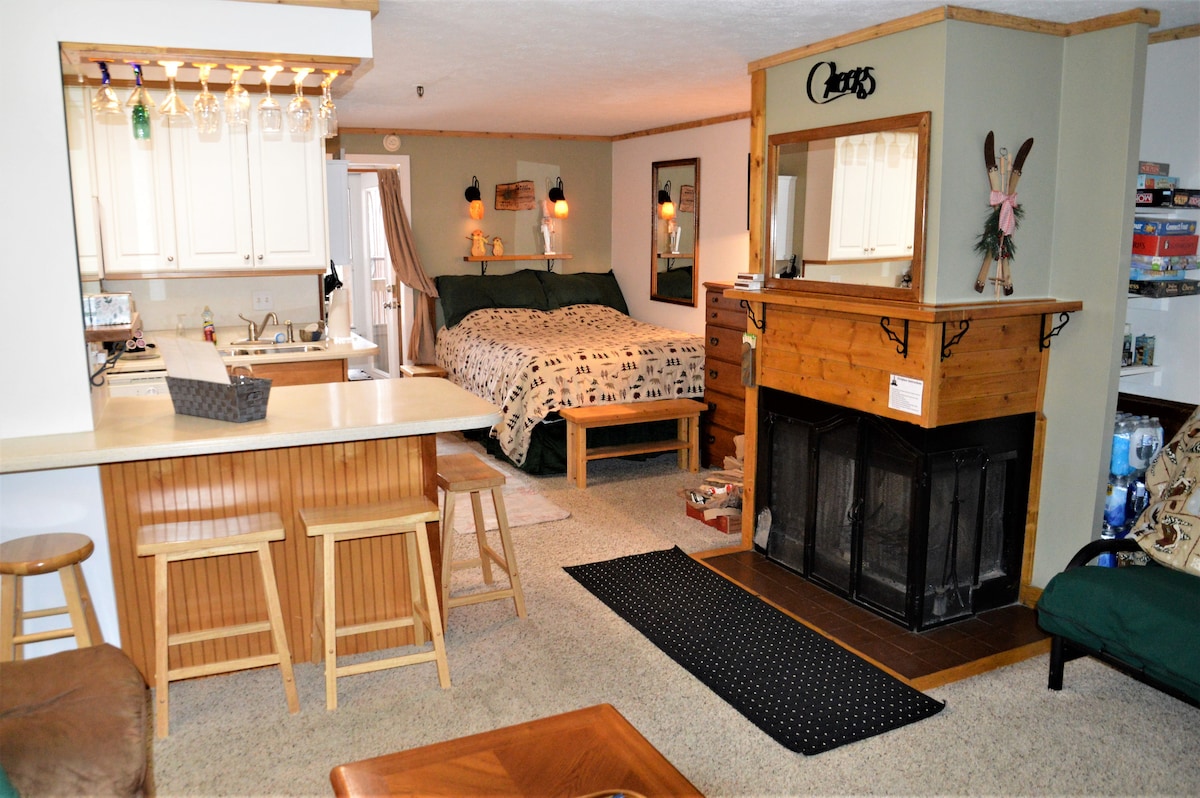 Stay here! In the coziest studio on the mountain, across from Powderidge slope/lift. Sleeps 4: queen bed + sleeper sofa (both with new foam mattresses), and a self-inflating air mattress, just in case. You'll have a full kitchen (with a Keurig and kcups), Roku streaming device, washer/dryer, a wood burning fireplace with FREE FIREWOOD (during ski season), and a balcony that backs up into a wooded area with plenty of deer to greet you. :)