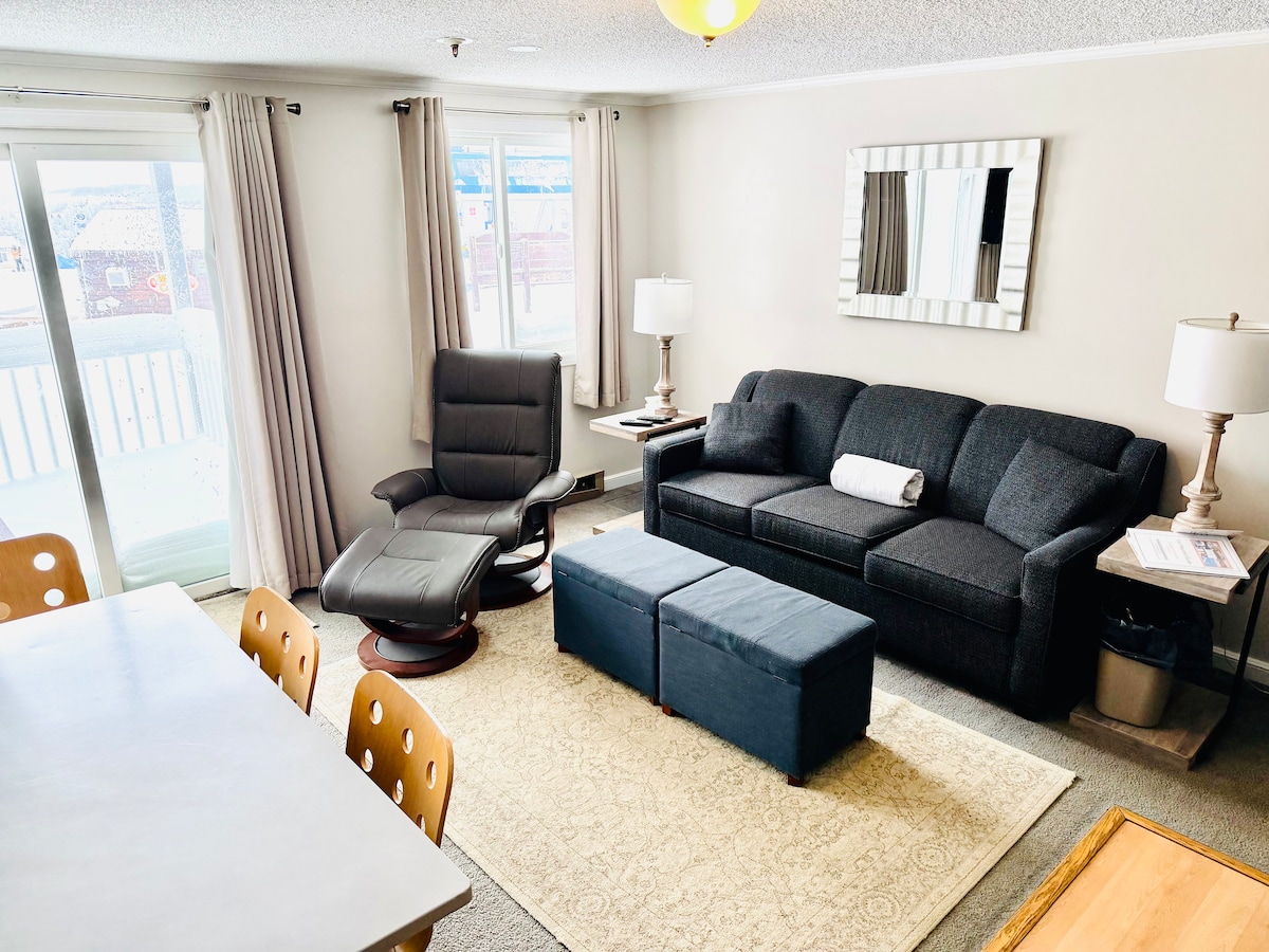 Completely remodeled November 2022 1 Bedroom Privately Owned Deluxe Top Floor Ski In/Out Unit Village Center Unit with Village View and Private Porch. Rimfire is conveniently located in the heart of the Snowshoe Village. Walk out to all shops and restaurants. Access to a ski locker 461, outdoor hot tubs, sauna, fitness room, hearth room with sitting area indoor and outdoor and optional underground heated parking for $20-day with no in and out privileges. Free parking is available across street.