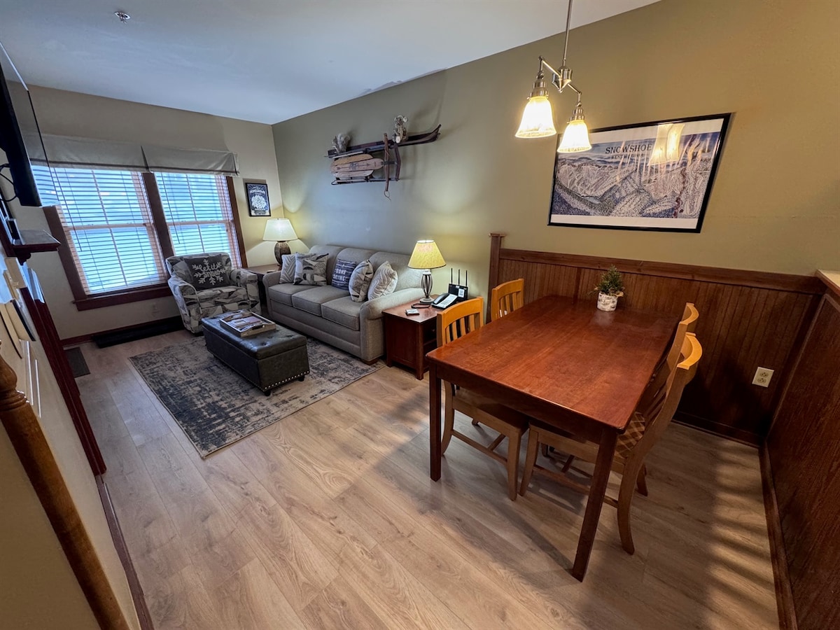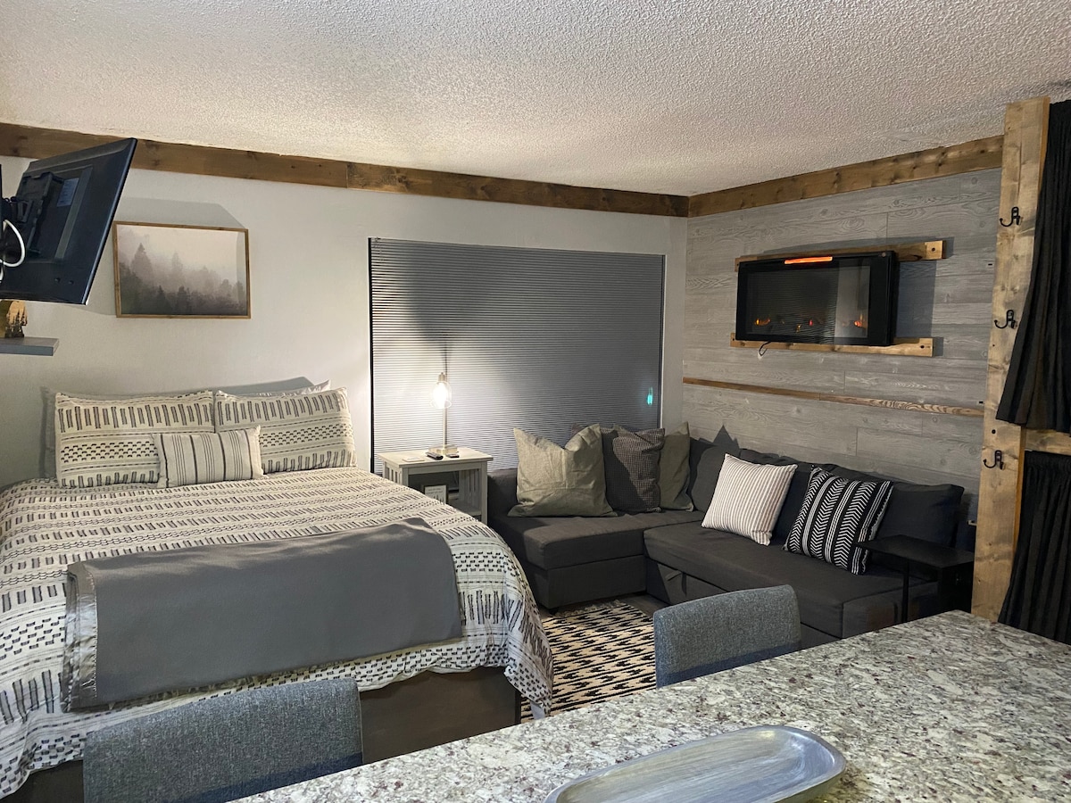 Modern meets old world charm in this newly renovated Highland House condo! Enjoy a fabulously appointed unit with many unique barnwood accents! The kitchen includes a full size refrigerator, dishwasher, microwave, toaster, coffee pot, induction cooktop and a pullout table for two. The king-sized memory foam bed is amazing and at 14 inches off the ground, is the perfect height to store unused luggage.
