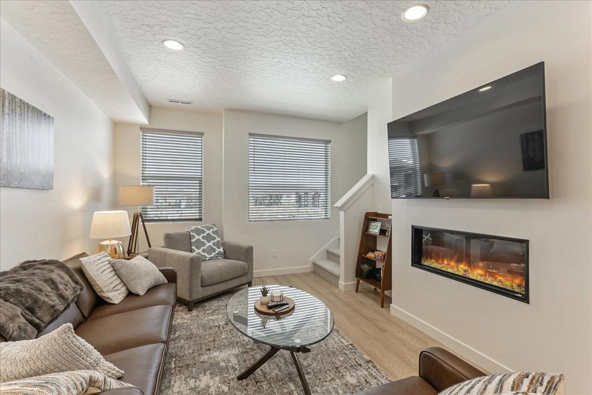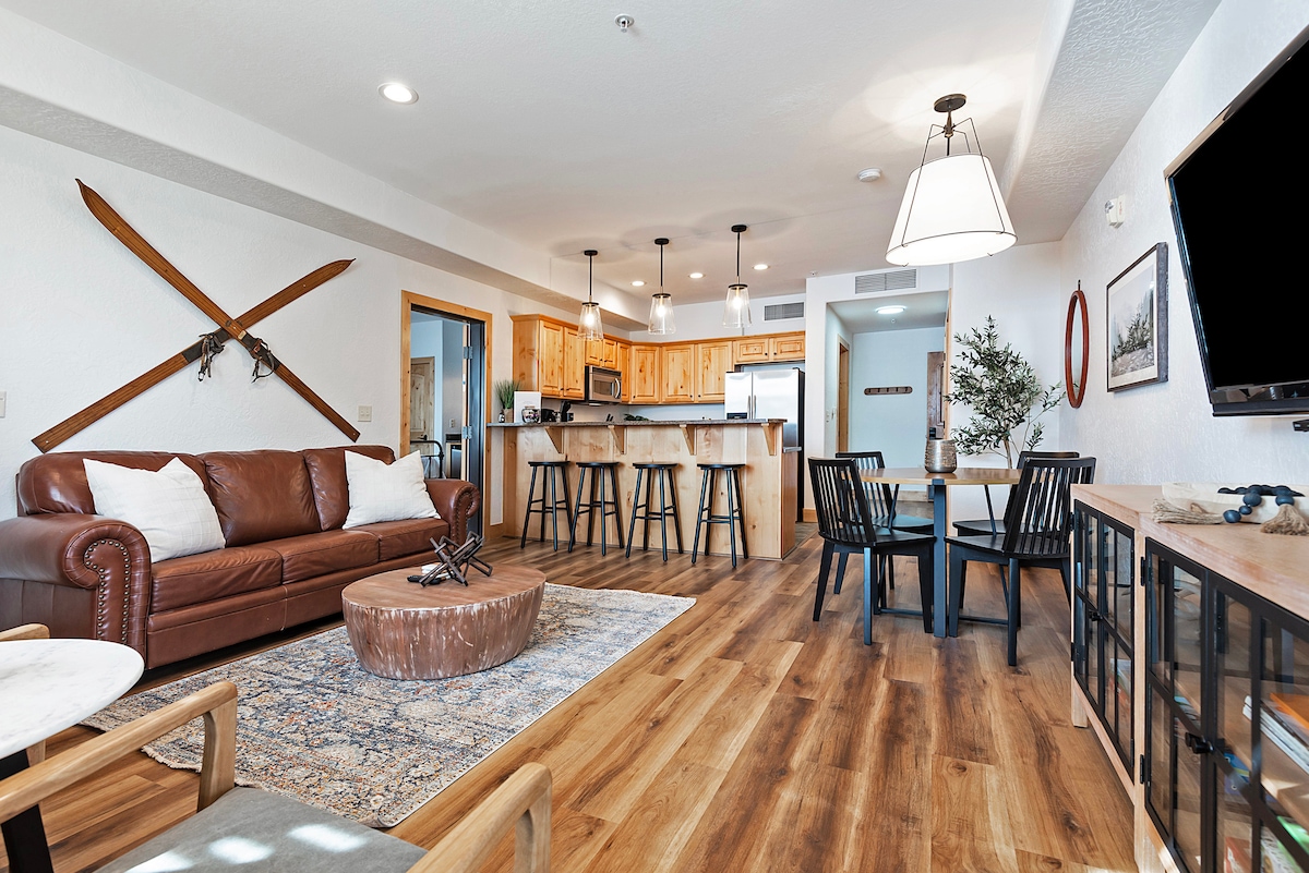 Relax in this beautifully designed two-level mountain condo at the base of Canyons. This family-friendly home has been thoughtfully designed, blending modern chic with a cozy rustic mountain feel, including vaulted ceilings with exposed wood beams and a stone fireplace. Located a short walk to the Cabriolet lift, there is no better starting point for your mountain adventures. Return home for a comfortable evening by the fire and your own private patio for grilling and taking in the views.