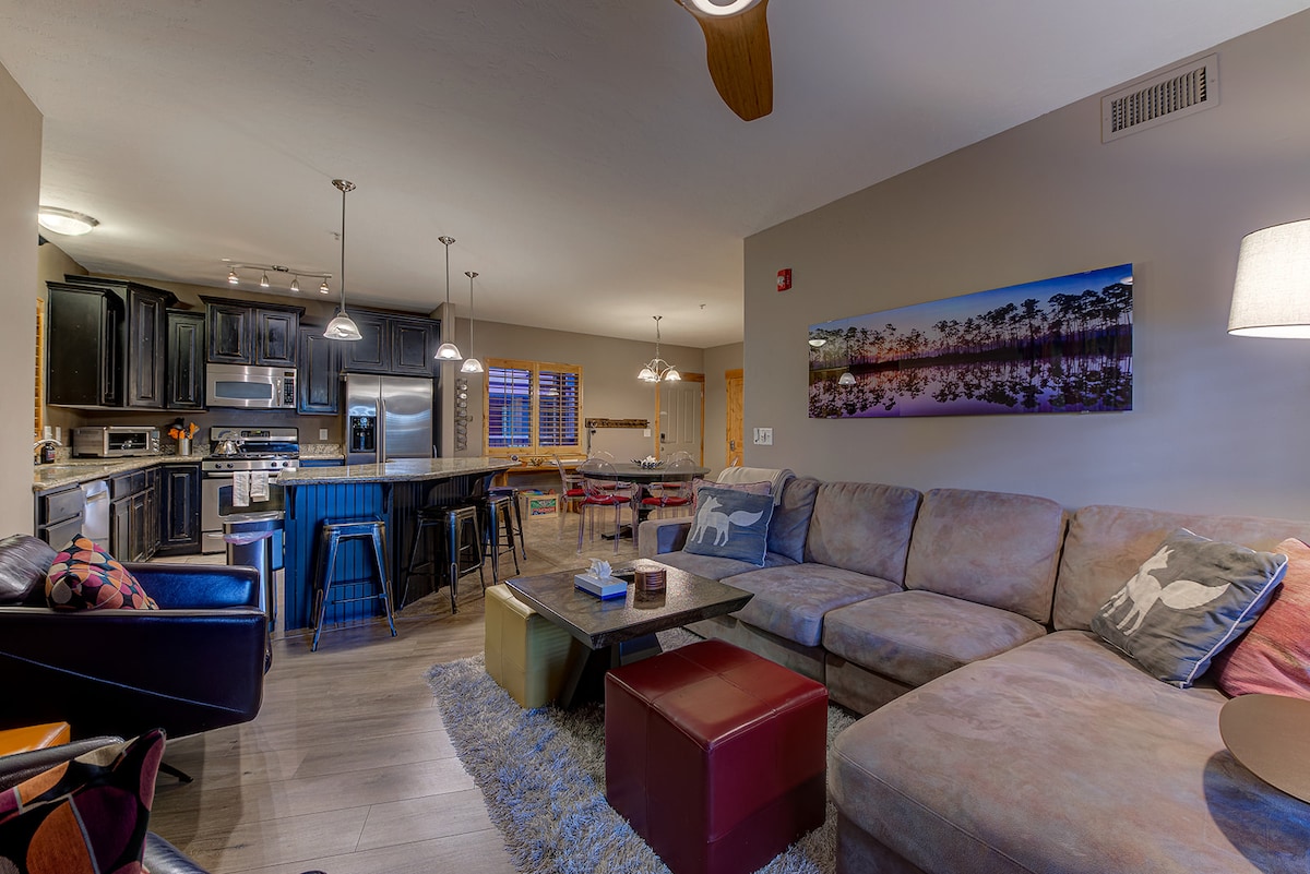 Relax in this beautifully designed two-level mountain condo at the base of Canyons. This family-friendly home has been thoughtfully designed, blending modern chic with a cozy rustic mountain feel, including vaulted ceilings with exposed wood beams and a stone fireplace. Located a short walk to the Cabriolet lift, there is no better starting point for your mountain adventures. Return home for a comfortable evening by the fire and your own private patio for grilling and taking in the views.