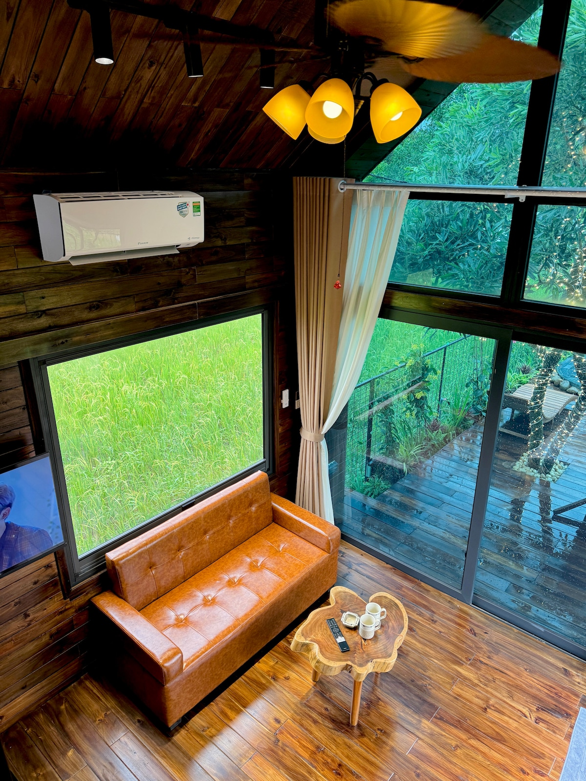 ✌️Phòng khách tiện nghi view hồ; nội thất hiện đại với điều hoà âm trần, lò sưởi, sofa; ghế lười nối thông bàn ghế ăn và bếp