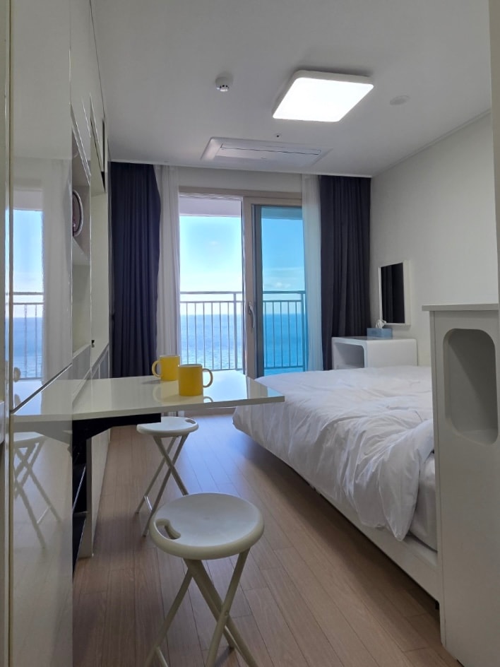 2023 Grand opening, E7 in Jukdo. -One Studio Room (Double bed) -Just in front of Dongsan Beach, 10Sec from the Beach -Check In from PM4:00 -Check Out by AM11:00 -3Min by car from Jukdo Beach, Ingu Beach -15Min by car from Jumunjin Beach, BTS MV location -30Min by car from Kyungpo Beach, Sok-Cho and Seolak Mountain. -Refrigerator, Electric range, Microwave, Dishware, Pot, Frying pan -Shampoo, Hair conditioner, Body shampoo, Tower -Smoking is prohibited in room Thank you:)