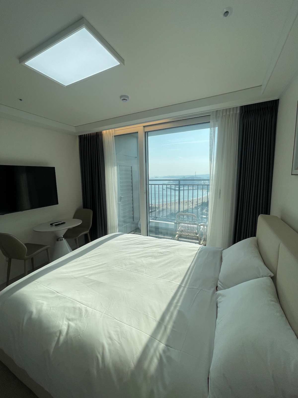 2023 Grand opening, E7 in Jukdo. -One Studio Room (Double bed) -Just in front of Dongsan Beach, 10Sec from the Beach -Check In from PM4:00 -Check Out by AM11:00 -3Min by car from Jukdo Beach, Ingu Beach -15Min by car from Jumunjin Beach, BTS MV location -30Min by car from Kyungpo Beach, Sok-Cho and Seolak Mountain. -Refrigerator, Electric range, Microwave, Dishware, Pot, Frying pan -Shampoo, Hair conditioner, Body shampoo, Tower -Smoking is prohibited in room Thank you:)