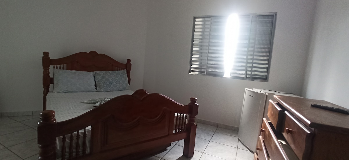 quarto de uma pousada nova que cabem ate 4 pessoas em uma cama de casal e cama solteiro auxiliar a pousada fica a 200 metros da linda praia do guaiuba el Guaruja o.quarto possui banheiro privativo e se pode usar a cozinha da area comum temos umngrande e relaxante patio com redes e rodeado pela natureza com passaros macacos dentre outros a pousada fica de frente para uma mata densa de muito verde e com.varios animas silvestres aproveite para passar días para relajar