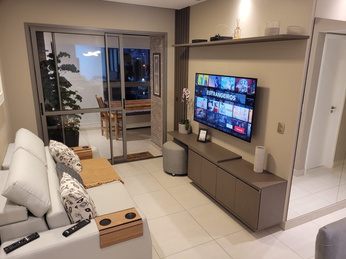 Apartamento incrível num prédio novíssimo, com decoração sofisticada e funcional. Nossa casa no inverno que oferecemos para hóspedes no verão. Ar condicionado split. WiFi 240Mb. TV 60" na sala e 35" nos quartos. Cook top, forno elétrico, microondas. Geladeira e freezer. Cozinha e copa totalmente equipadas. Lava louça, Lavadora / seca roupa. 1 suite com cama Queen e um quarto com banheiro e duas camas box. Varanda gourmet fechada com vidro, com churrasqueira e geladeira extra de bebidas.