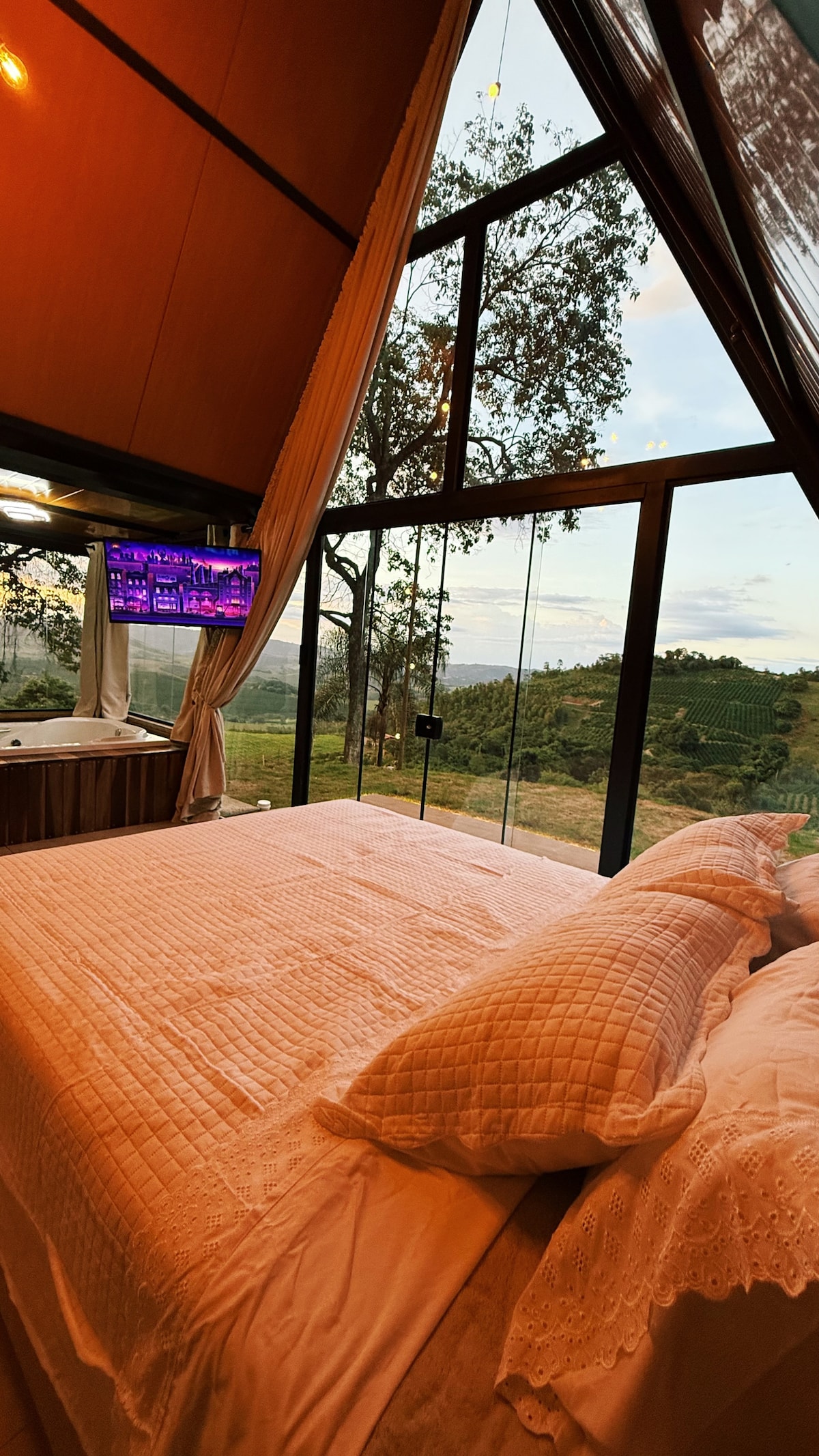 Privativo á 7,5km do centro de Águas de Lindoia, Jacuzzi(35º) Extra grande, para 4 pessoas, com porta e 2 janelas com circulação na parte térrea, rede suspensa, fogueira, cozinha equipada e ar condicionado (quarto). Com área privada em meio às montanhas, com uma vista única. Internet Vivo e Starlink. Após a sua reserva ligaremos explicando desde a sua chegada, dicas de passeios. Nosso atendimento é do começo ao fim. Fazemos questão de fazer um Check in personalizado levando vc até a propriedade