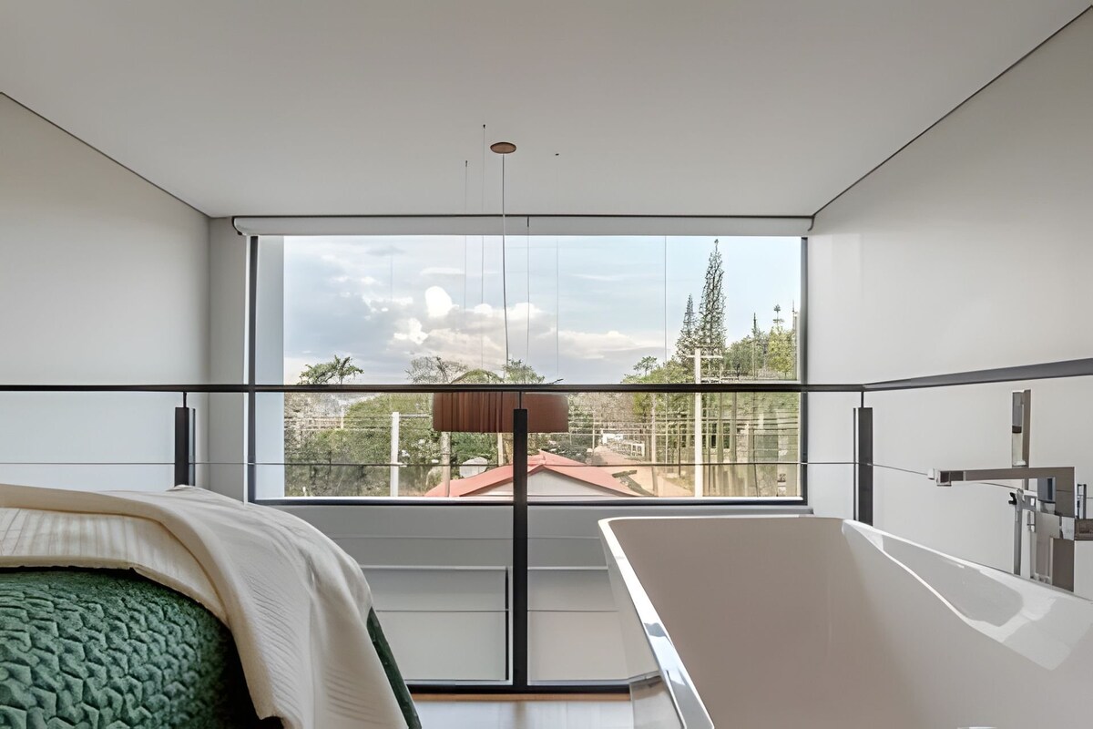 Refúgio romântico e exclusivo em meio à natureza de Serra Negra, perfeito para casais que buscam conforto, privacidade e momentos especiais. Desfrute de hidro privativa com vista para as montanhas, lareira de chão, lounge sob pergolado e o som dos pássaros. O Loft F2 combina luxo, design e romantismo em um cenário inesquecível, silencioso e cercado por verde — a apenas 7 minutos do centro.