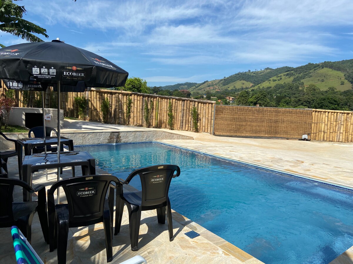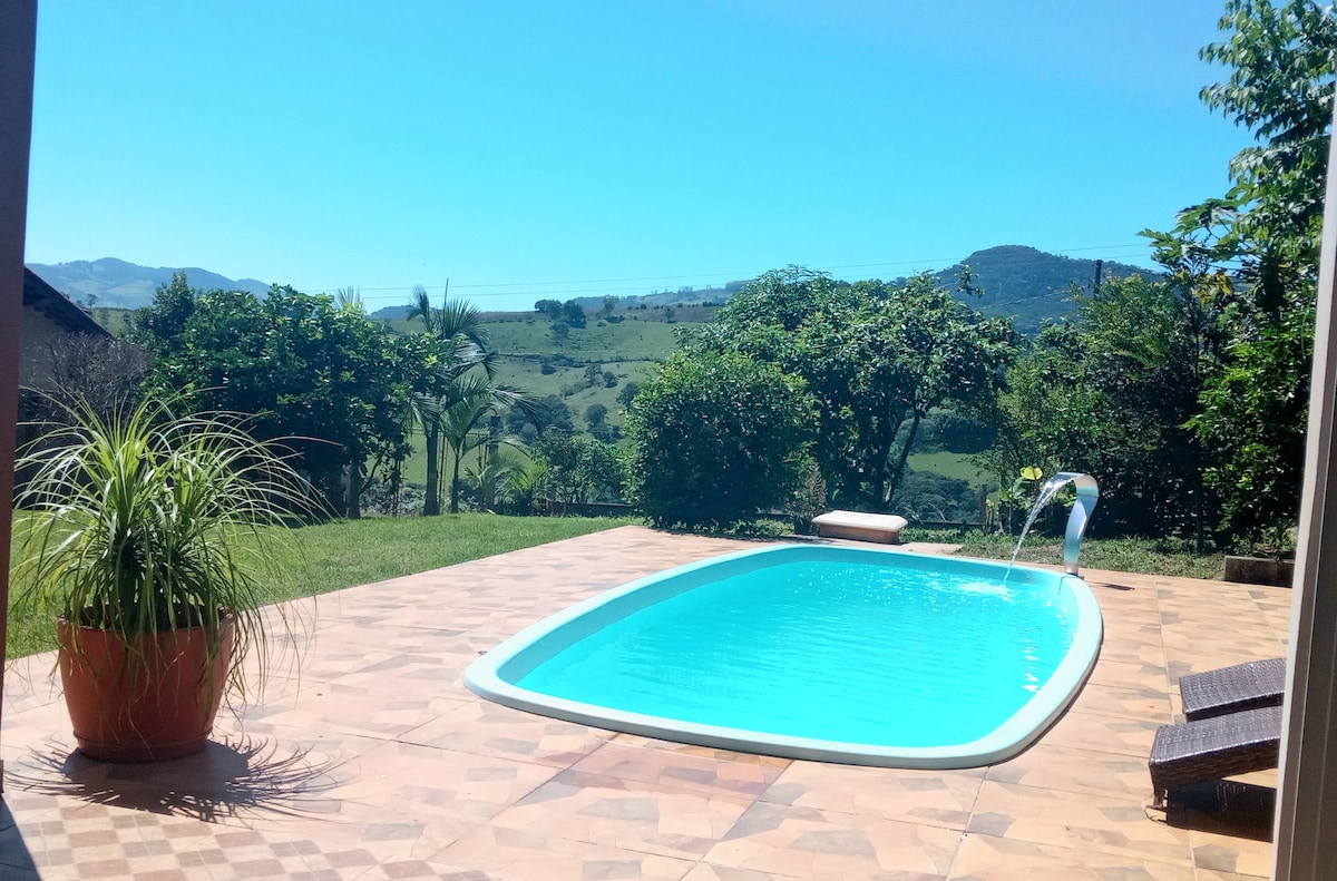 Venha desfrutar de deliciosos momentos com toda sua família. Garantimos uma cozinha super equipada!Em meio as montanhas no vale das Aguas.Paz e natureza possibilitarão momentos inesquecíveis! Contato com animais,piscina, jacuzzi ,decoração moderna,aconchegante e com todo conforto,camas de primeira em nossa casa de campo. Durante a semana você poderá fazer seu home office pois nossa internet é ótima! Estamos a 5 km do centro! Quartos com ar/condicionado e Piscina climatizada eNÃO tem Pernilongo