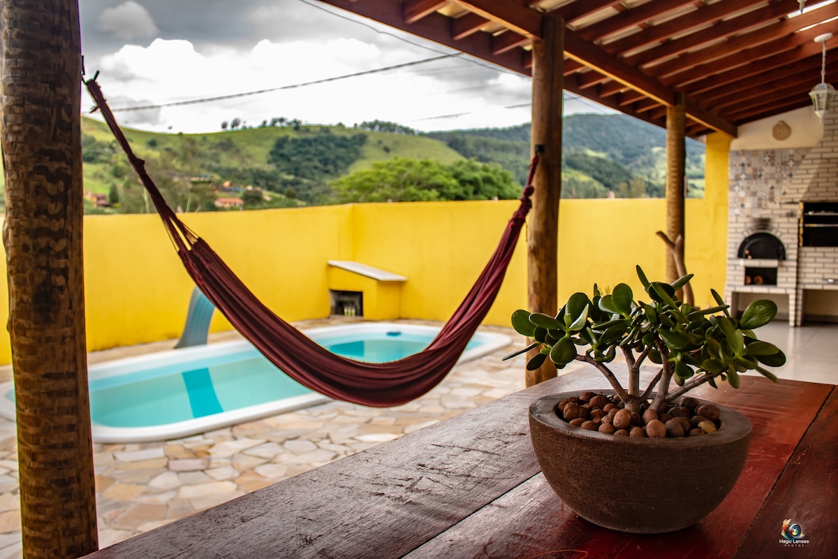 Casa exclusiva com vista incrível , churrasqueira, 3 suites todas com varanda de frente para a piscina, sendo a principal com banheira , cama queen e ar condicionado . A casa possui, Wi-fi, self check-in, cxs de som, sala com lareira e smart TV. Localizada no alto da montanha com vista paradisíaca. Local seguro todo cercado com tela, sustentável , 100% energia elétrica produzida aqui e portão automático . Seu animal de estimação pode passear por toda a propriedade ( 2000 m2 ) .