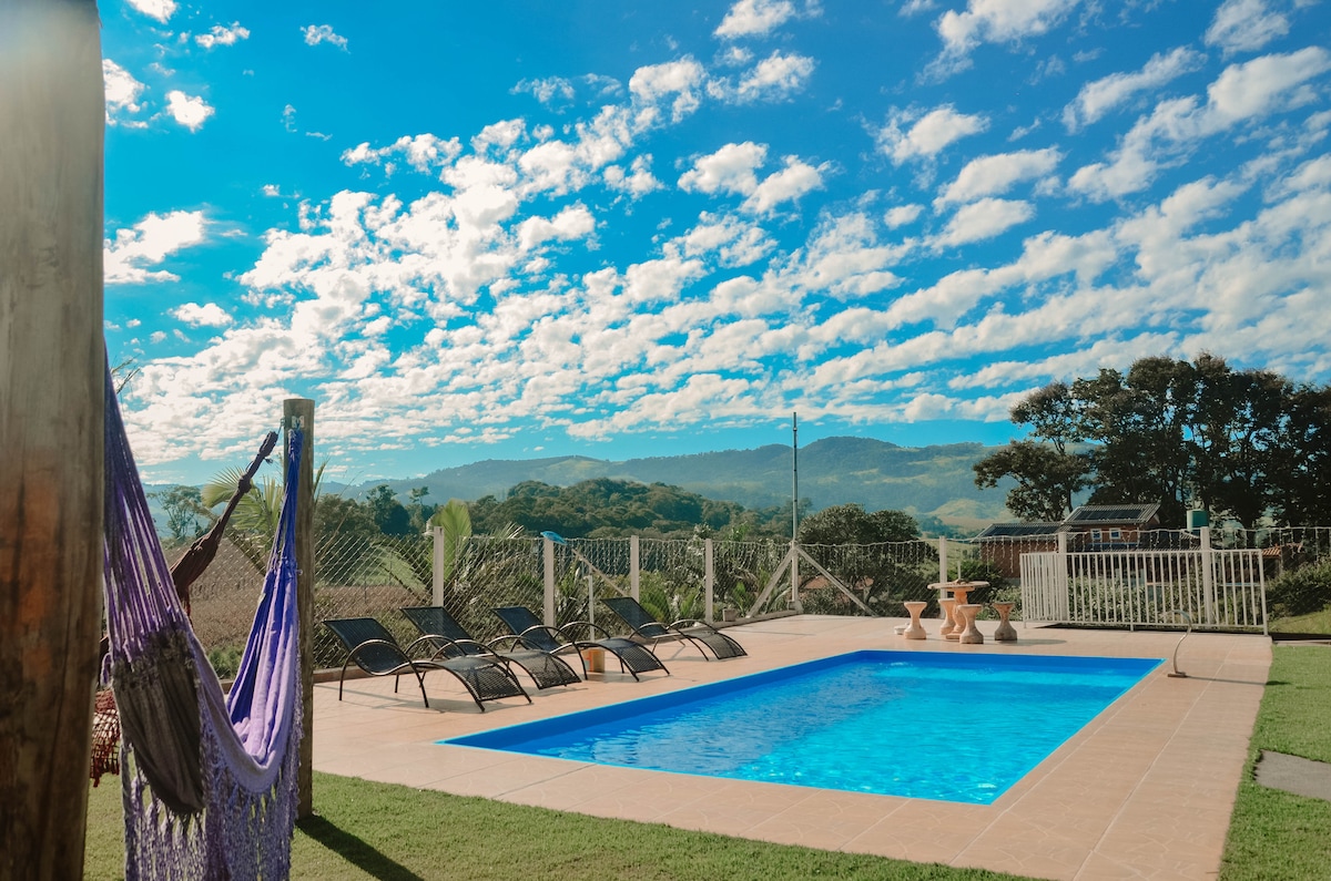 Temos piscina com vista para as montanhas, redário, fogo de chão, playground infantil e mesa de pebolim, diversão garantida para toda família!! Fornecemos roupa de cama (lençol, fronhas, mantas e travesseiros), temos todos os utensílios domésticos!! Graças a nossa excelente localização você está a menos de 10 minutos dos principais supermercados, lojas e até mesmo de pontos turísticos. Seu pet é bem vindo aqui, 100% fechado, com toda segurança para você e seu pet!