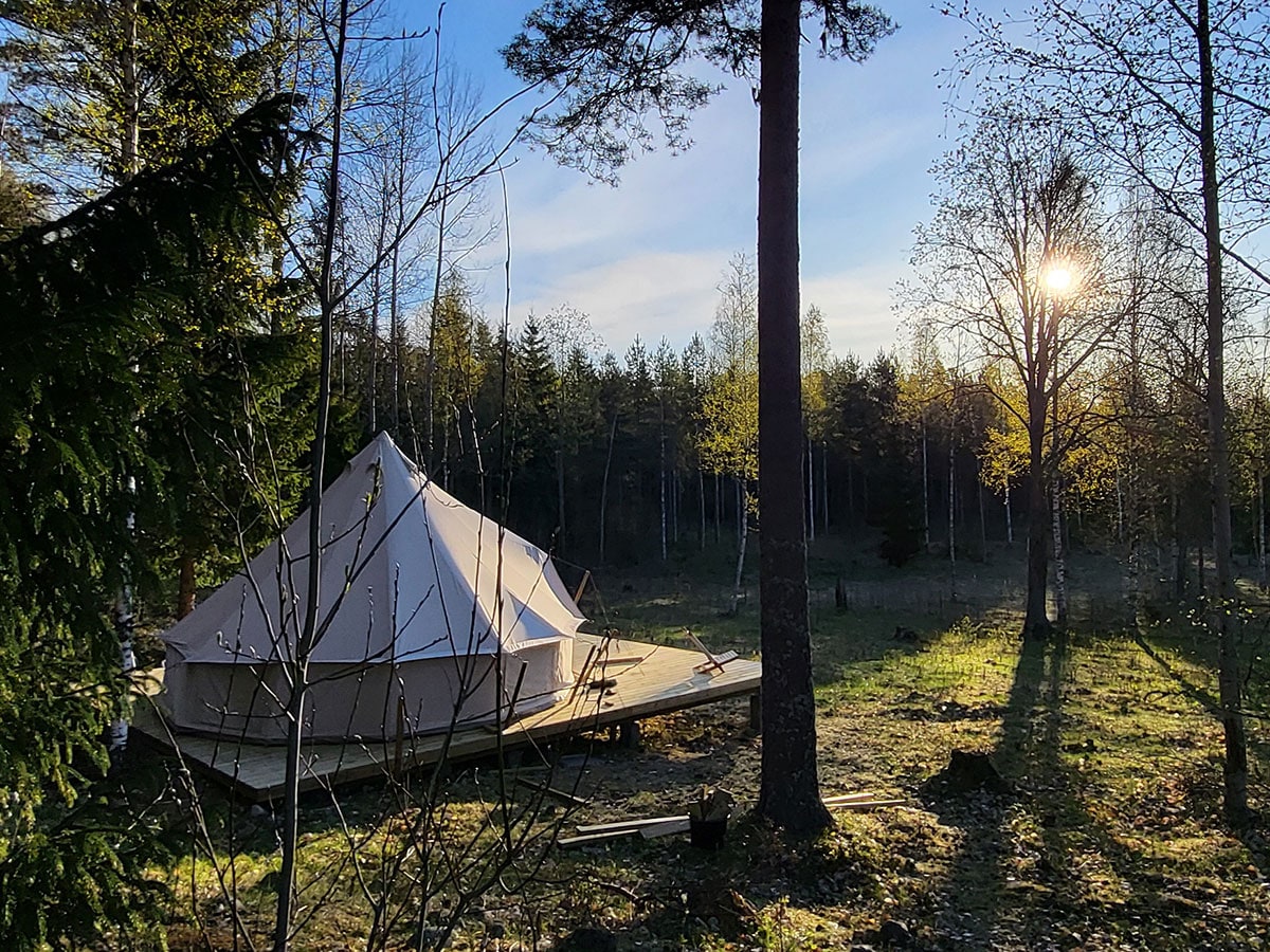 森林中的豪华露营帐篷,配备桑拿和热水浴缸