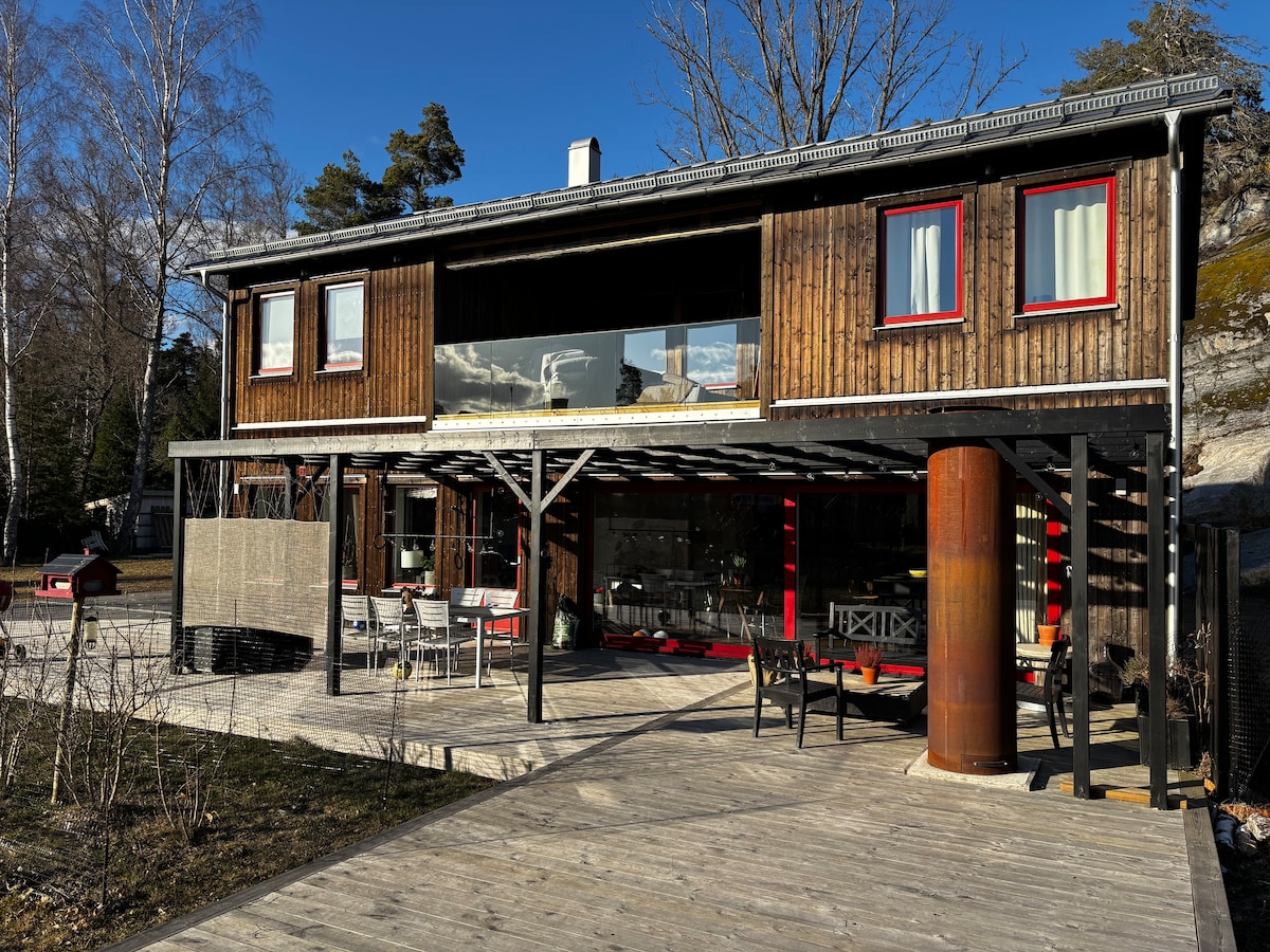 Featured in Airbnb Unique Stays - Three Cabins That Break the Mold Modern house with huge windows and balcony around the house. Great garden towards the forest. It feels like your in a treehouse when in the living room. - Sauna to rent in the garden. - 450 meters to the lake. - Climbing wall, trampoline and slackline in the backyard. - Great internet connection. Two bedrooms and a huge kitchen/living room with a fireplace. Perfect for 4-5 guests or a family who likes to cook, play and swim.