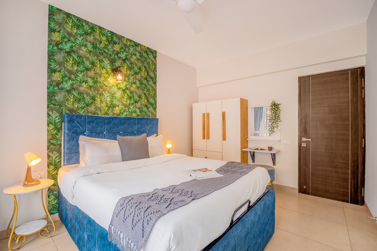 Modern Boho Apartment | Minutes from North Goa's Beaches.A cosy, fully furnished 1BHK retreat perfect for couples, friends, or small families. Highlights: - Stylish boho interiors with a warm vibe - AC in bedroom & living room for comfort - Smart TV + High-speed WiFi - Equipped kitchen with RO water, cooktop, fridge & washing machine - Shared swimming pool (9 AM–6 PM | swimwear mandatory - On-site gym available as a paid facility - 24/7 security for peace of mind - Free Parking