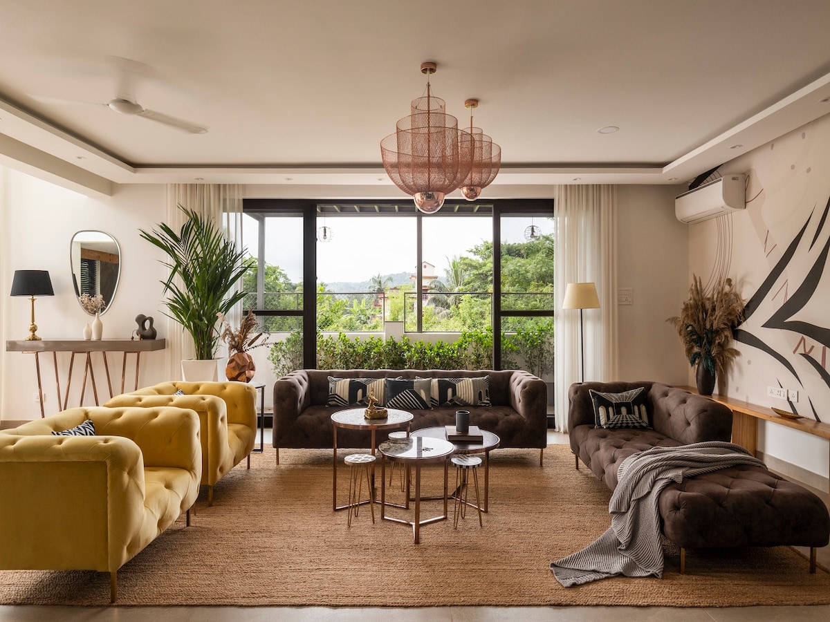 Unwind at this artistic duplex garden villa, located in a secluded & peaceful residential gated complex in Assagao. The villa is only minutes away from some of the most affluent bars, cafes, restaurants and boutiques that Goa has to offer. Enjoy the serene forest view from the living room and lush private garden. Pamper yourself with the personal caretaker to serve you while you enjoy plush sofas, a massive 75-inch TV, king-sized beds with premium beddings, and a fully equipped kitchen.