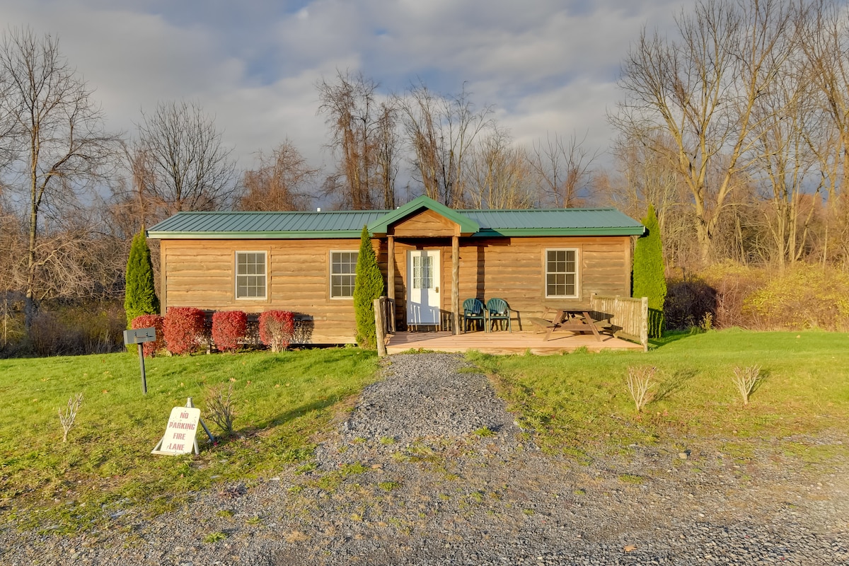 Our quiet family hunting lodge is situated on 29 picturesque acres of beautiful, rural, upstate NY farmland. The cabin is uniquely built with high ceilings and is filled with antique farm equipment & taxidermy animals. We have a pond full of fish, nature trails, wildlife, gardens and the sunsets, rises and stars are incomparable. Hot tub, volleyball court, pool table, darts, board games and MORE for you to enjoy. Ask about adding on one of our A-Frame Tiny Cabins for additional guest lodging.