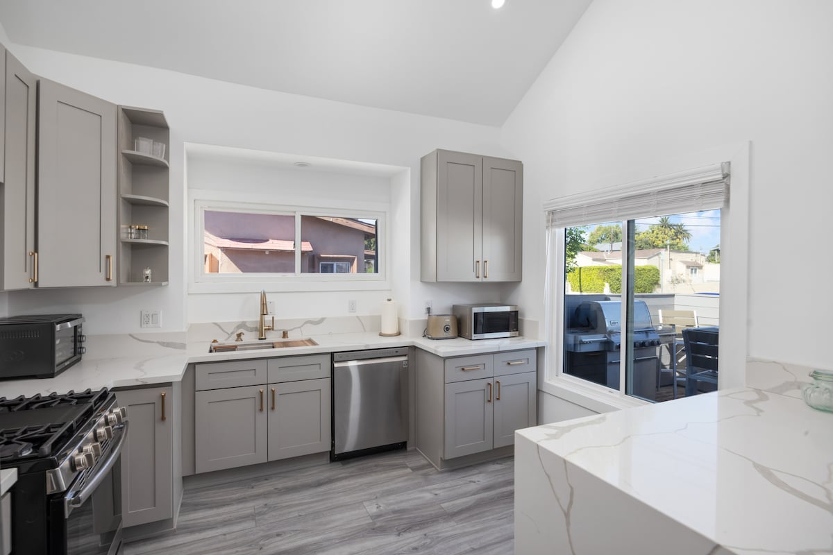 This newly renovated high-tech luxury apartment is a private escape within sight of SoFi Stadium (1 block), The Forum, 10 min from LAX and 20 min from downtown LA. Enjoy this completely renovated modern apartment that includes an open kitchen, quartz countertops, stainless steel appliances, large refrigerator with water filter, dishwasher, gas stove/oven, microwave, disposal, coffee maker, toaster, completely stocked with all the kitchenware to make any meal!