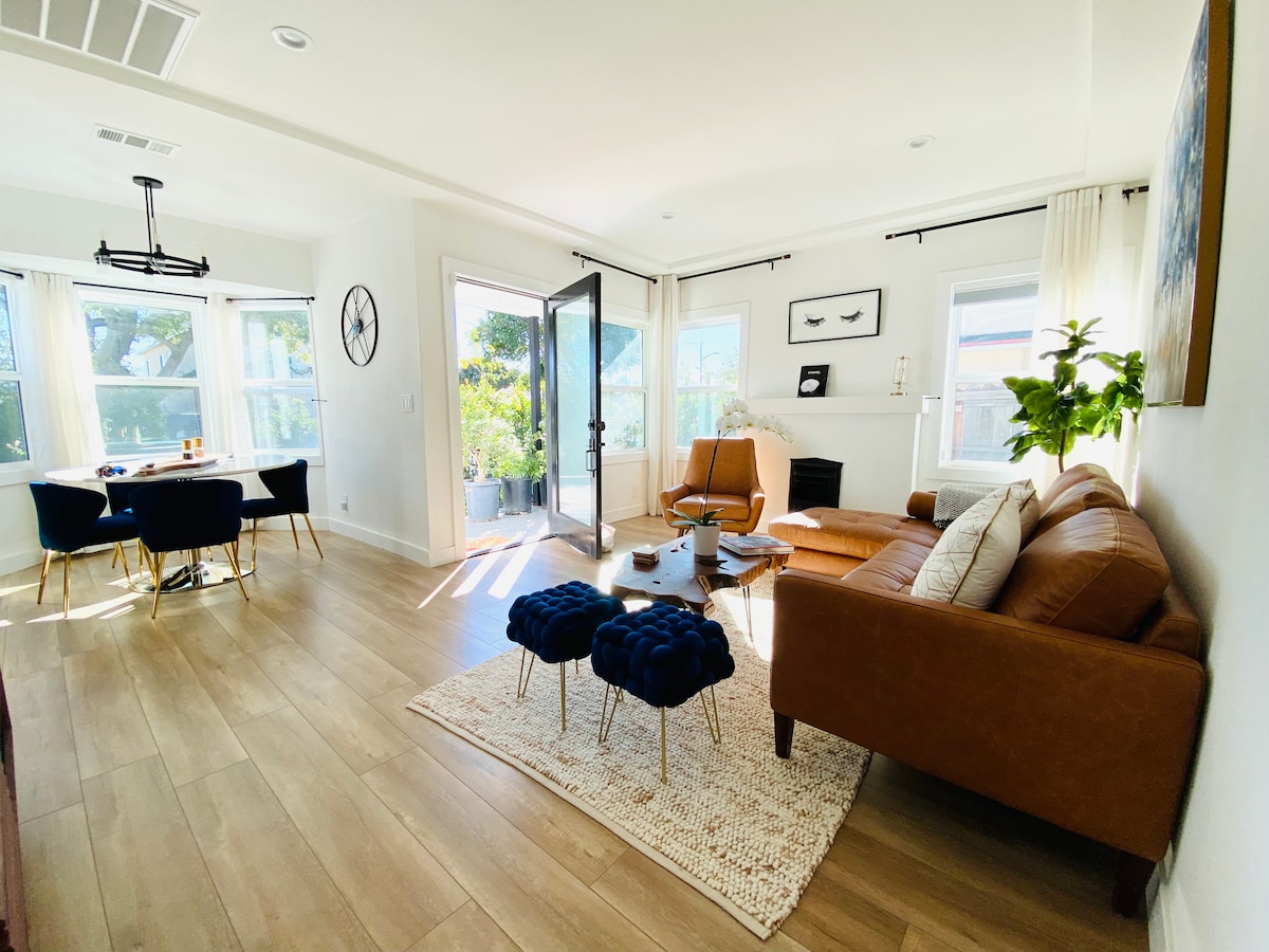 Newly renovated modern farmhouse with a spacious private backyard, lush landscaping, lemon trees, and a furnished gazebo ideal for relaxing before or after concerts, games, and events. This art-inspired LA-vibe home is centrally located in a quiet Southern California residential neighborhood. Just 10 mins to LAX & SoFi/The Forum, 18 mins to DTLA, 15 mins to beaches, 25 mins to Universal Studios, 30 mins to Disneyland. Fully furnished with equipped kitchen, smart TV, and hotel-grade beds.