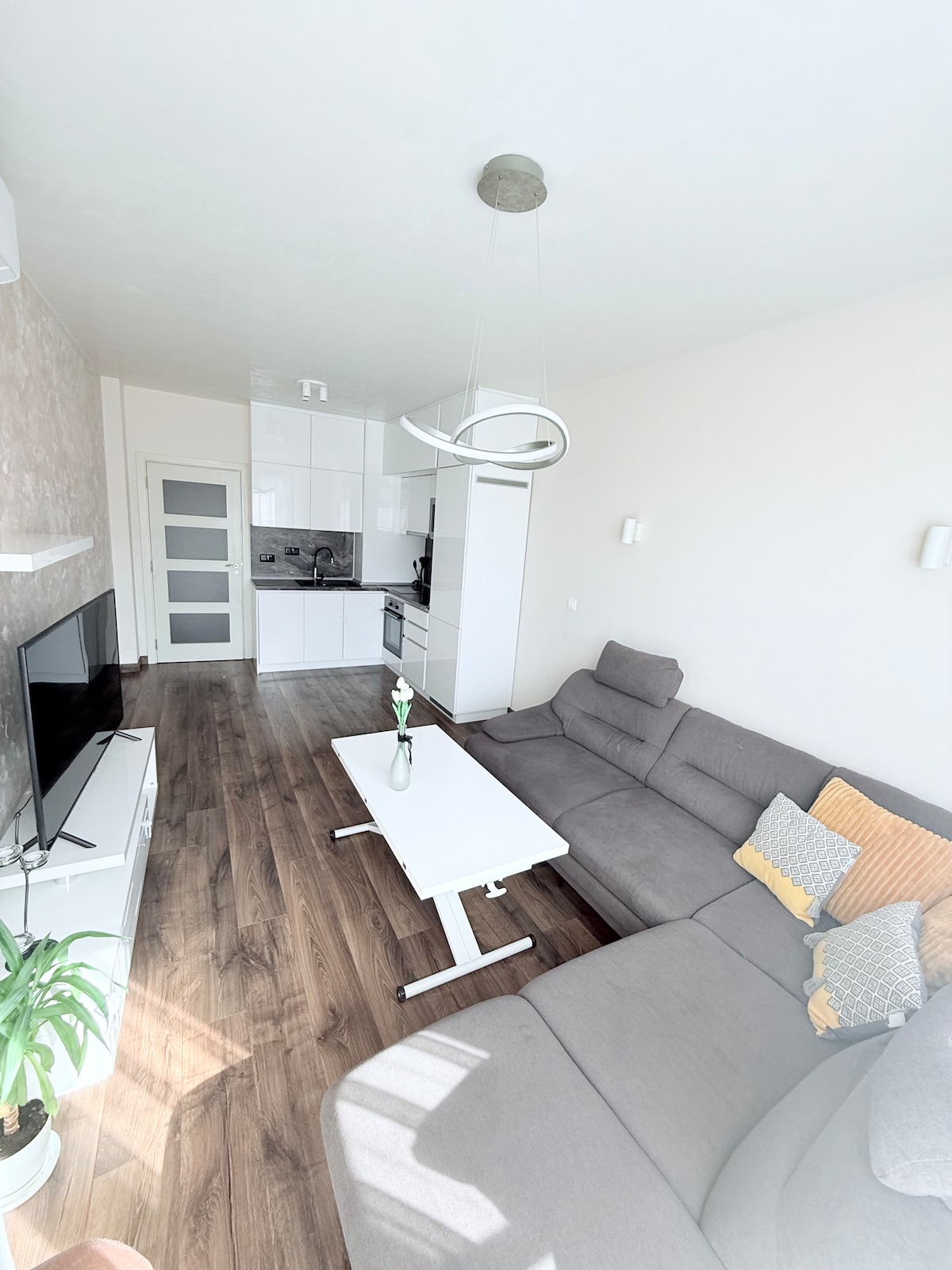 Welcome to a spacious, modern 2-bedroom apartment designed for both relaxation and productivity. This bright and stylish home offers everything you need for a comfortable stay. - Near Sofia Airport - Private parking space Enjoy breathtaking city skyline and mountain views, a cosy living area, and top-notch amenities tailored for short- and long-term stays. The building is fully accessible and friendly for people with special needs, ensuring a seamless experience for all guests.