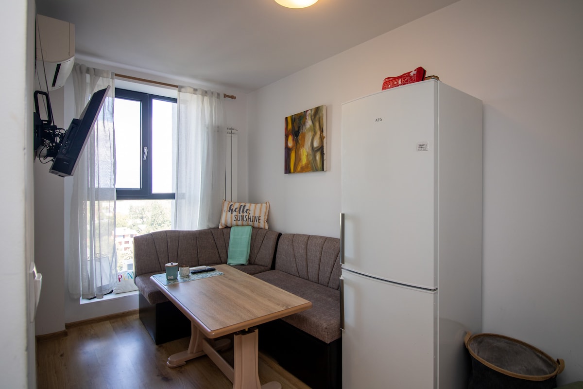 This small cozy apartment with amazing city view is located in a relatively new residential building in a quiet area, yet very close to the centre of Studentski grad which offers a variety of restaurants, cocktail bars, huka bars, night clubs and many more. It is also 6 minutes away from Sofia Ring Mall where you will find plenty of stores and supermarkets as well as many other entertainment spots. The city centre and the airport are both 15 minutes away. The parking is free of charge for you.