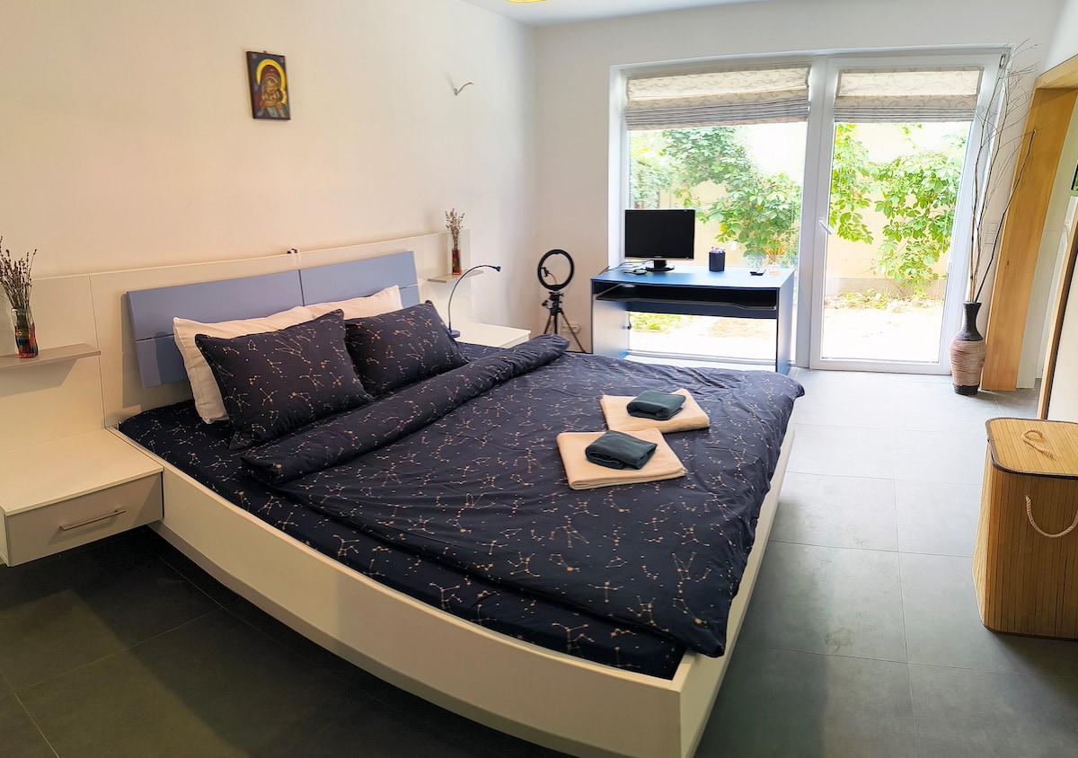 The house is located in a very calm area of Sofia on a very private property. The bathroom has a bathtub asn is directly connect to your bedroom, which is on the second floor. Here you also have a workspace with desk, office chair, screen and a breathtaking view. downstair is the spacious living room with a big couch, tv, dining table, fully equipped open kitchen, workout area with a spinning bike and there is also a small bathroom. The yard has a pool, a bbq, 2 sun loungers and a table & bench