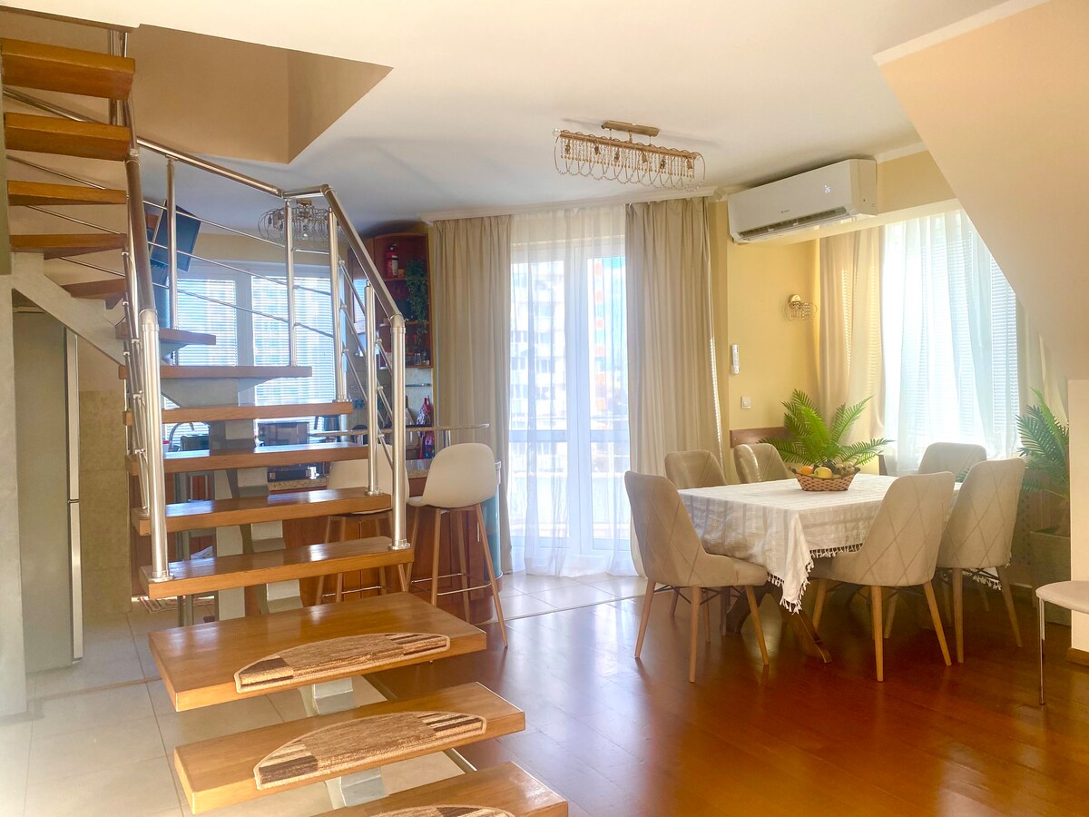 Стилен и уютен апартамент подходящ за семейство с дете или трима възрастни. Разполага с всички необходими удобства - напълно оборудвана кухня с фурна, керамични котлони, съдомиялна, кафе машина за капсули "Долче Густо", електическа кана. Отоплението и охлаждането е решено с висок клас климатик. Удобна спалня за двама души (140 х 190 см.) и разтегателен диван (120 х 190 см.). Има смарт телевизор 43 инча с кабелна телевизията 150 канала и високоскоростен интернет. Тоалетка с огледало и тераса.