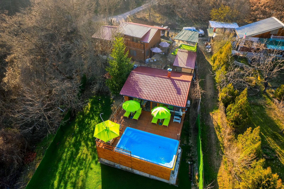 This secluded villa offers 300 sq.m. of living space. It accommodates up to 10 guests. Located in a private estate only 38 km from Sofia and 300 m from Lake Iskar. Cozy lounge with a fireplace, dining table and a bar is the place to relax and entertain family and friends. At the end of a wonderful day take a dip in the indoor Jacuzzi or play billiard sipping a glass of bubbly. Spacious private terrace surrounded by pine trees. Complimentary espresso, cappuccino, tea and mineral water.