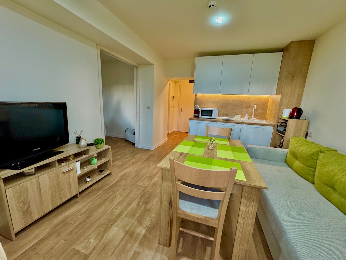 Spacious studio with fully equipped kitchen, a double comfortable bed and large sofa bed, wardrobe, commode and dinning table, comfortable chairs, TV and all you need for rest or home office in the mountain. The studio has its own large bathroom, as well as a seating area, and a terrace. Apt. B53 is located in the Borovets Gardens complex, a 7-minute walk from the gondola station. The building has a security and free guests parking.
