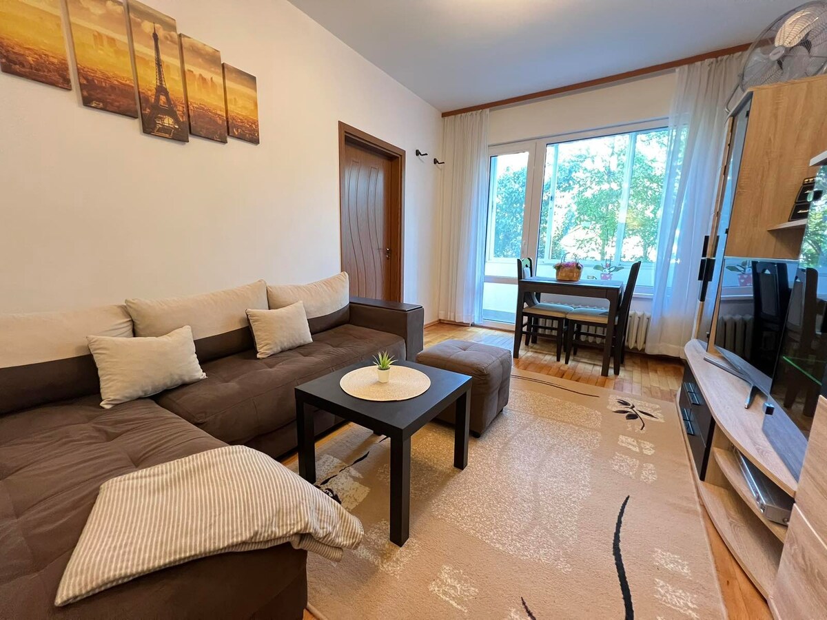 Stay in this modern apartment on the 2nd floor with elevator access. A 10-minute ride to the airport and city center, it's only 100 meters away from one of Sofia's largest shopping malls, located in a quiet business area. Enjoy free NETFLIX, fast WIFI, coffee, and free underground parking. Equipped with air conditioning, a 50" 4K smart TV, washing machine, dryer, hair dryer, iron, and more. The hosts are happy to recommend local hotspots but the place is all yours.