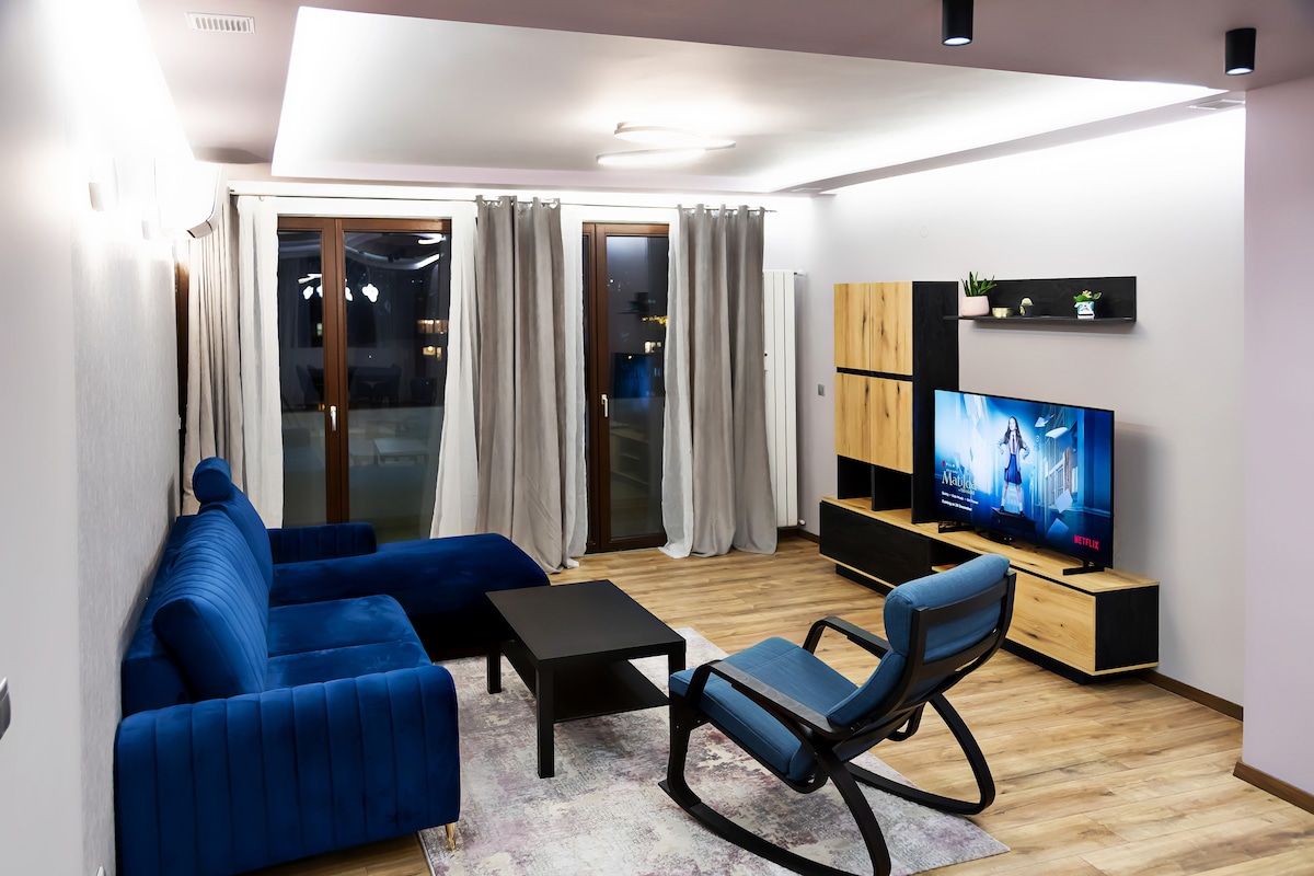 Stay in this modern apartment on the 2nd floor with elevator access. A 10-minute ride to the airport and city center, it's only 100 meters away from one of Sofia's largest shopping malls, located in a quiet business area. Enjoy free NETFLIX, fast WIFI, coffee, and free underground parking. Equipped with air conditioning, a 50" 4K smart TV, washing machine, dryer, hair dryer, iron, and more. The hosts are happy to recommend local hotspots but the place is all yours.