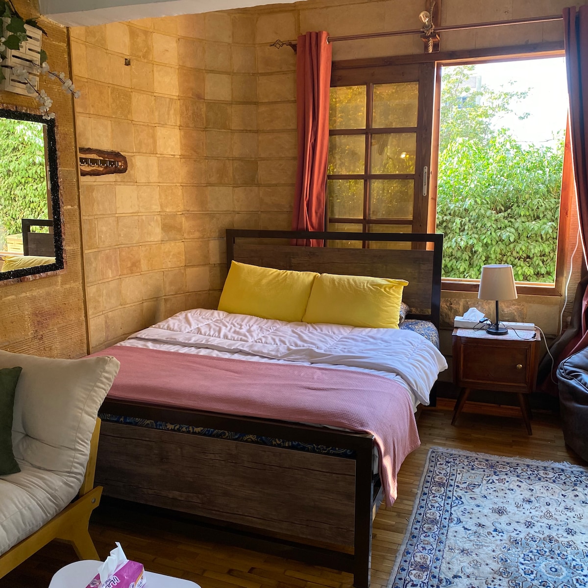Unwind in this fairytale tiny house in a lush Maadi garden, a walkable Cairo neighborhood known for its safety, greenery, and great places to eat. Sustainably built and styled with antique and vintage furniture and decor, this romantic studio includes a bedroom with a kitchenette and a bathroom, as well as an office space accessible from the garden. The magical shared garden features lounging & dining areas, a hammock, an outdoor kitchen with a pizza oven, and a fountain to set the mood.