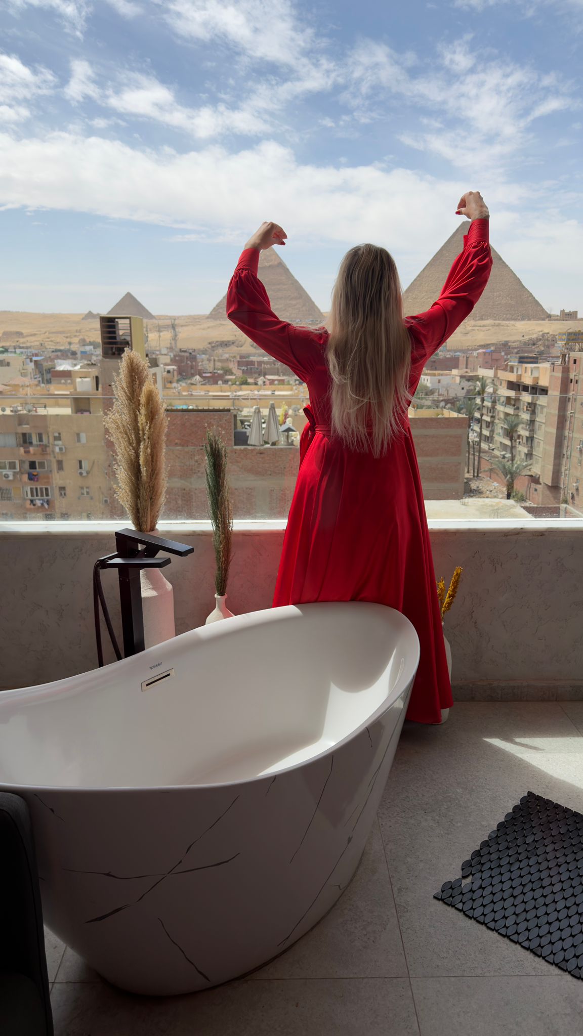 This stunning design 3 bedroom apartment enjoys the view of Great Giza Pyramids along with great bathtubs Please note that this unit is located in a local and modest neighborhood. Guests staying should expect that the surrounding areas to the building are not of high standards Please note that Arab and Egyptian citizens are required to submit proof of marriage before check in. The space This fascinating 3 bedrooms apartment is located in Giza's district which the closest to the Giza Pyramids.