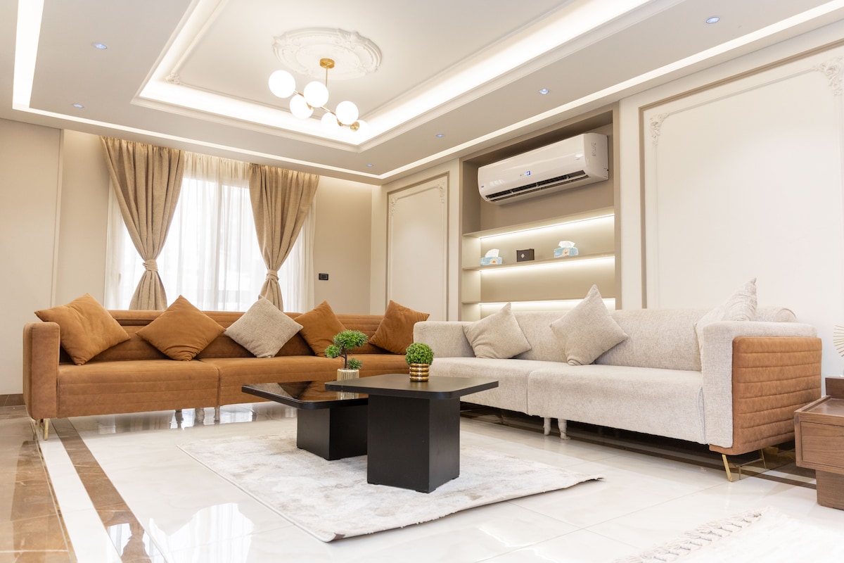 Pyramids view with10 mins to visit ,(3 rooms/2 bathrooms) It's an entire apartment that no one shares with guest. Upscaled elite quiet area for families/groups , 15 mins walking to GEM,( 30 mins by car to old museum) ،what makes us special that we are not (hostel or inn) we are a real cozy house, (host) and (Guest) no employees (We treat our guests honestly as friends, not just guest. We can manage the pick up and drop off from and to the airport if u want. U also can ask for recommendations .