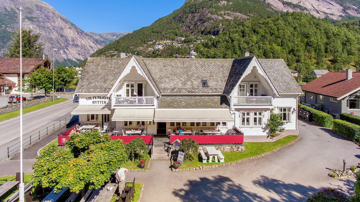 Welcome to Vik Pensjonat og Hytter, Eidfjord, where you can soothe your senses with the sound of silence and breathe in the fresh mountain and sea air. In this double room with a shared bathroom that includes breakfast, you're invited to live this experience. Our charming boutique hotel was built in 1928 and stands out as a gem in the Westland, surrounded by the spectacular fjords and mountains of the rugged Norwegian landscape.