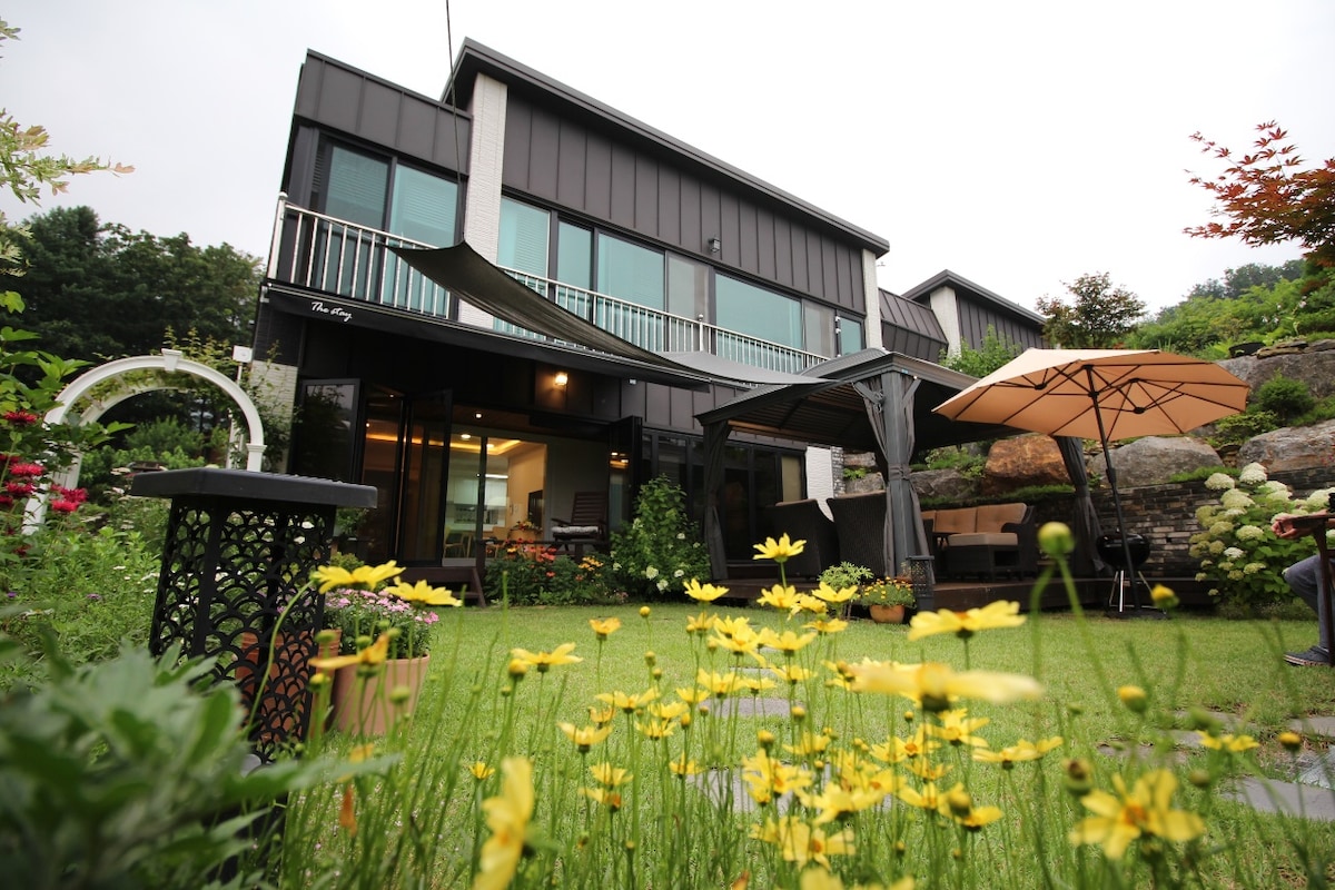 (독채)더 머물다 IC 에서 2분 낭만 있는 캠핑 느낌 뷰맛집~바베큐 불멍 감성 펜션