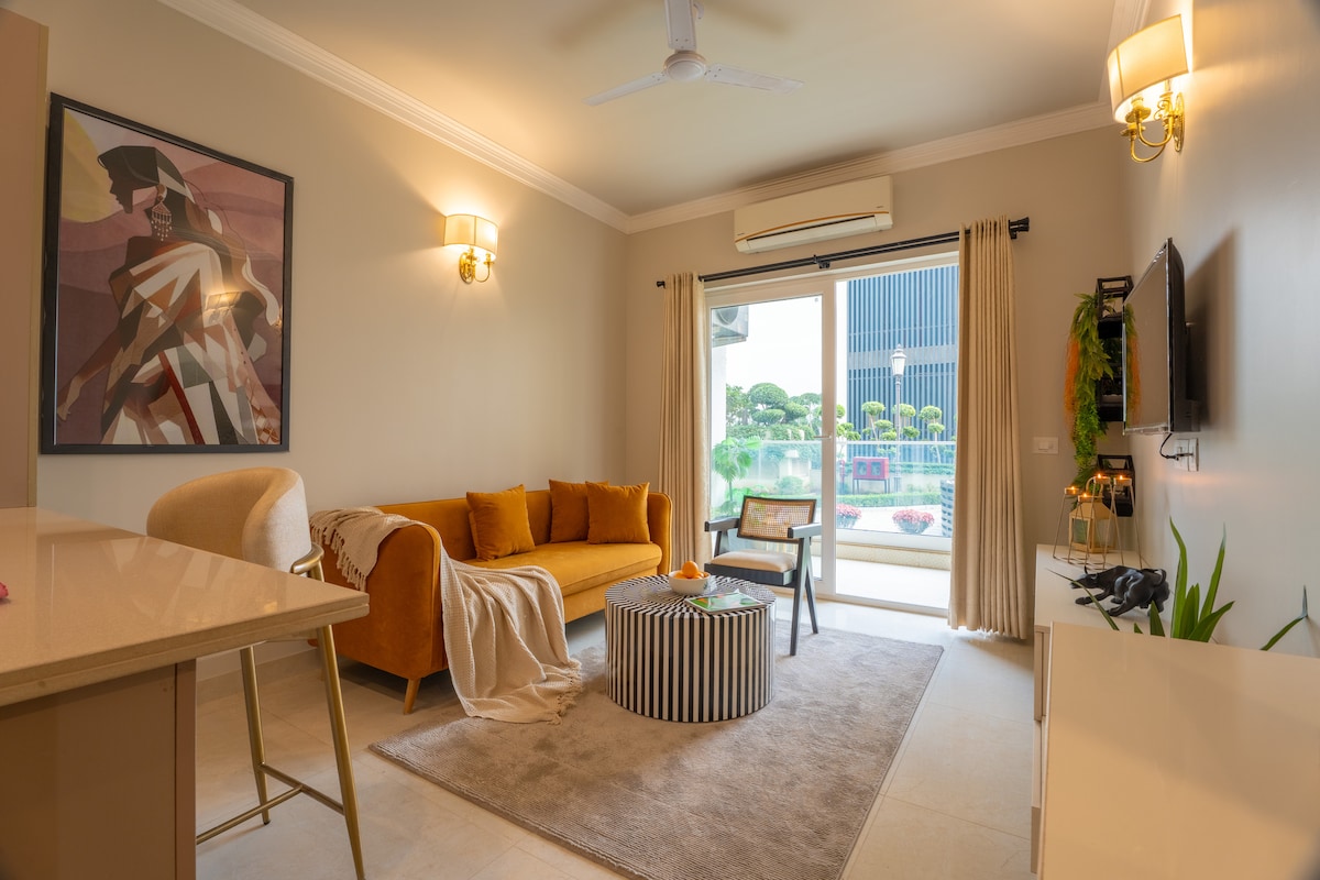 Wake up to stunning Aravalli views at this elegant 1BHK serviced apartment in Central Park Flower Valley - a peaceful, resort-style retreat in Gurugram yet away from the city’s hustle & bustle. Enjoy a cozy living room, fully equipped kitchen, and a serene bedroom opening to a spacious balcony with breathtaking peaceful views. Guests have access to a large swimming pool, clubhouse, and a fine-dine restaurant overlooking a tranquil water body.