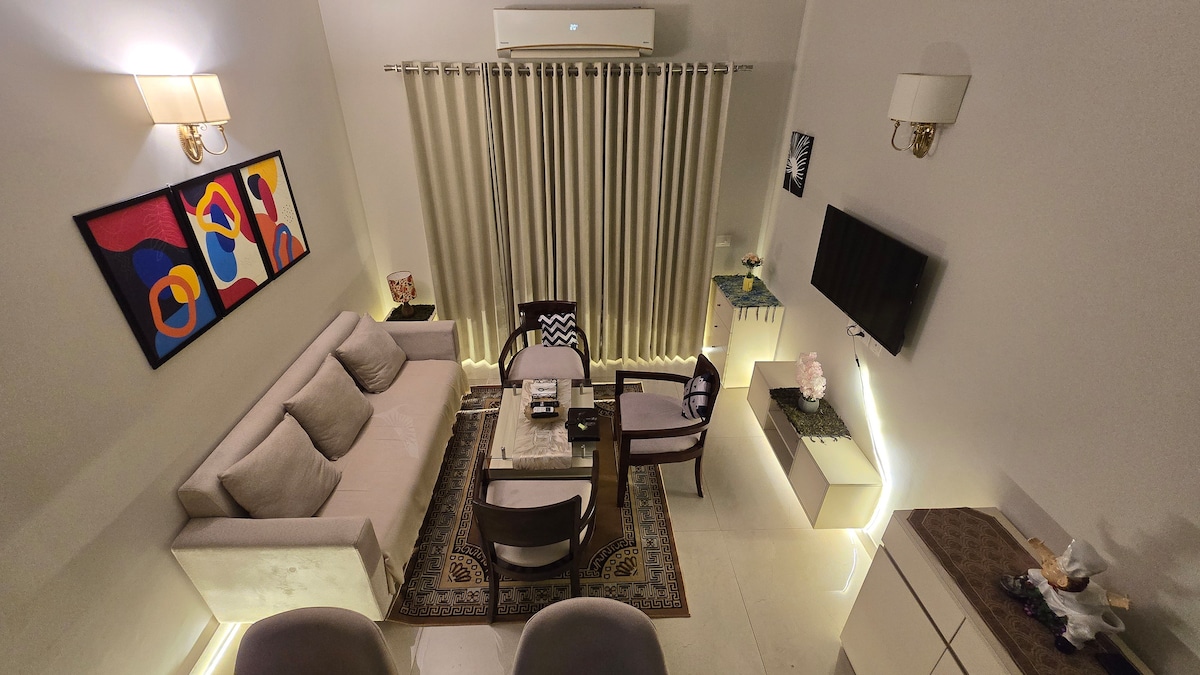 Nestled amidst the bustling Golf Course Road, yet offering a serene view of the Aravali forest range, this loft is a true urban oasis. Step into our spacious home with a living area, cozy dining area, and attached kitchen. Bedrooms offer rustic charm, comfy beds, ample storage, and access to peaceful terraces. A single bathroom is fully equipped. Enjoy views from two large terraces—one of the city and the other of the serene Aravali Forest, with a patio.