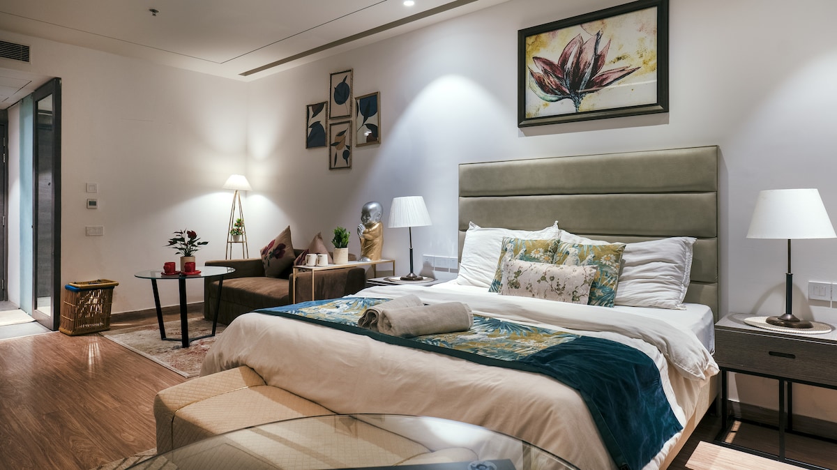 Wake up to stunning Aravalli views at this elegant 1BHK serviced apartment in Central Park Flower Valley - a peaceful, resort-style retreat in Gurugram yet away from the city’s hustle & bustle. Enjoy a cozy living room, fully equipped kitchen, and a serene bedroom opening to a spacious balcony with breathtaking peaceful views. Guests have access to a large swimming pool, clubhouse, and a fine-dine restaurant overlooking a tranquil water body.