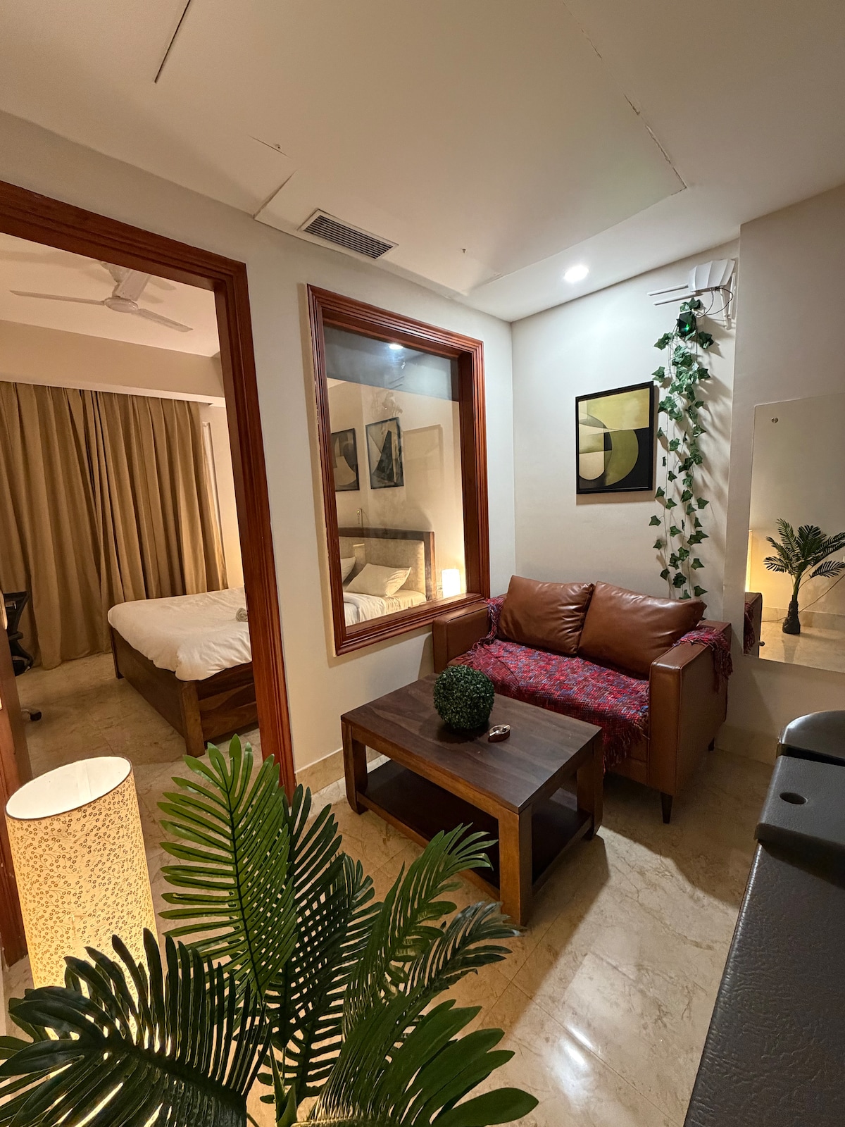 Stylish City Pad in Gurgaon's Heart! Escape to this beautifully designed apartment in Sector 49, blending urban charm with total comfort. Enjoy a cosy king-size bed, a full kitchen, a sleek bathroom, a workspace with Wi-Fi & a private balcony offering city views. ✦ Prime Location ✔ 20 mins from the IGI Airport & near DLF Cyber Hub, malls & cafes. ✦ Self Check-in & Hassle-Free Parking ✦ Roof Top Swimming Pool (IN4 499/+ Taxes per person) ✦ Ideal for romantic escapes, solo, or corporate trips.