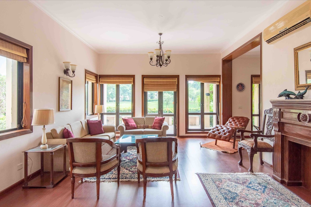 Nestled within a lush golf course, 1.5 hrs away from the heart of South Delhi, this Villa comes with 3 plush bedrooms, each with its own attached bathroom. The Villa has a fully equipped kitchen ensuring you have everything you need. Entertainment is never compromised with a smart TV at your disposal, along with high-speed WiFi. Venture downstairs to our cosy basement featuring an outdoor mural. And if indulgence beckons, you're just a stone's throw away from the ITC Grand Bharat Hotel.