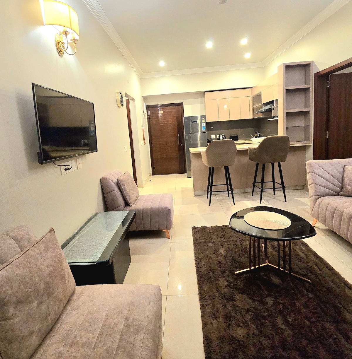 Welcome to this another beautiful and cozy property by Tulip Homes. It is situated on 16th floor & completely fresh apartment with garden patio which makes it unique in class. The place is perfect for relaxing and enjoying scenic view of modern architecture. Apartment is loaded with smart tv (all applications works), big mirror wall, a cozy double bed, big wardrobe with locker, 5 seater sofa, stylish nesting coffee tables, fridge, microwave, induction, electric kettle, toaster, iron & much more