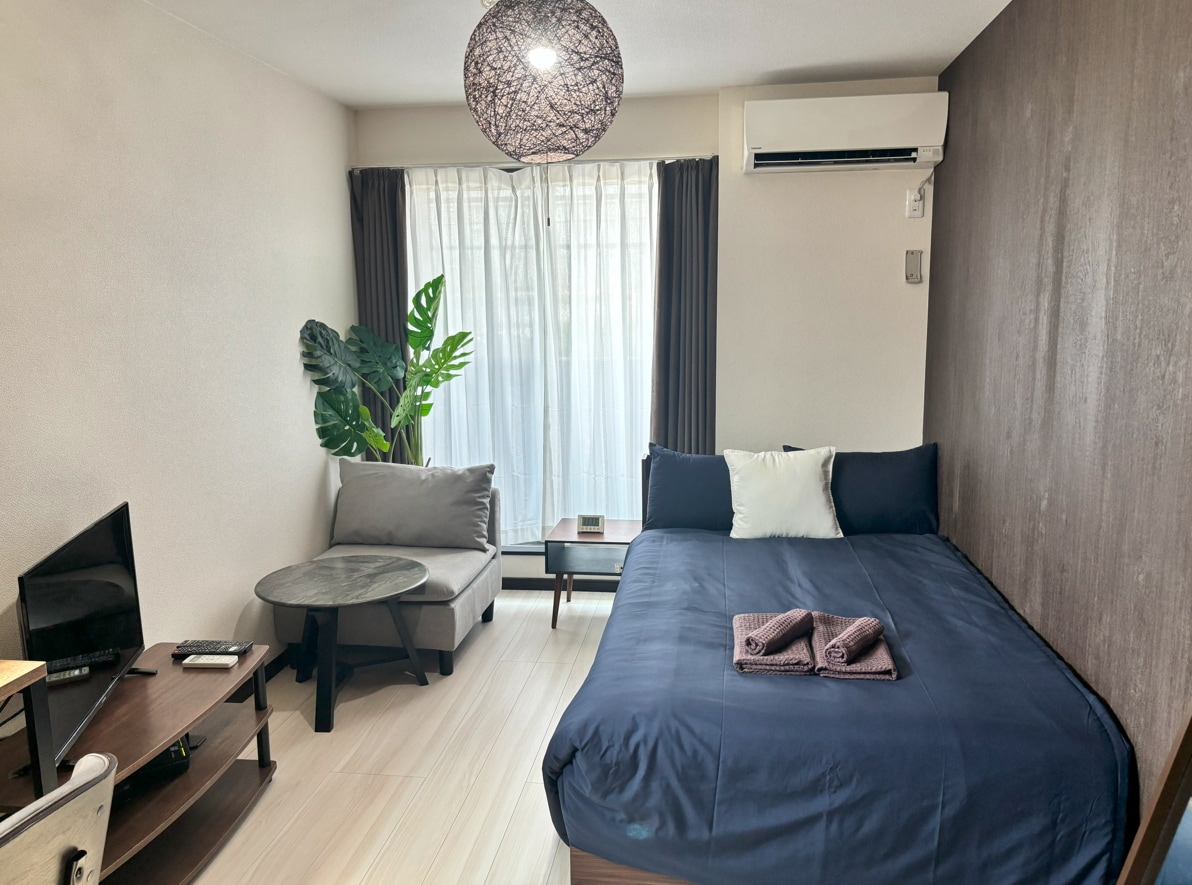 Just a 2-minute walk from the station, Palette House is a cozy and stylish retreat perfect for exploring Tokyo. The industrial-style kitchen includes an island bar, full cookware, wine glasses, and a water dispenser—ideal for cooking and evening drinks. The living room features natural driftwood décor and a comfy sofa, while the Japanese-modern bedroom offers a refined, relaxing space. With thoughtful amenities and warm design, it’s a perfect base for couples and families.